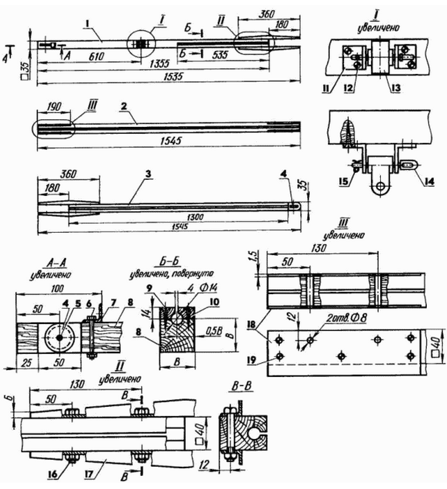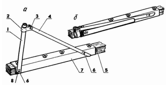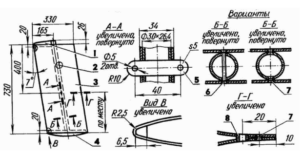 ПОДУКЛЮЧИНЫ (рис. 6) изготовьте из алюминиевых труб диаметром 22 мм. Нижние концы их сплющьте, заложив вставки - алюминиевые пластинки толщиной 7 мм. Шарнирно (но не свободно, с натягом) прикрепите их толстыми заклепками к вертикальным полкам соединительных уголков первого и четвертого стрингеров (ближе к корме). К тем же полкам (ближе к носу) подобным образом прикрепите и подкосы из алюминиевых труб круглого (диаметорм 20 мм) или овального сечения. Хомуты сделайте из мягкой алюминиевой пластины (например, от спинки детских саней). В нерабочем положении подуключины и подкосы складываются вдоль соединительных уголков.