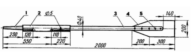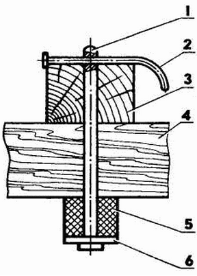 УКЛЮЧИНЫ. Если вам не удастся найти заводские металлические уключины (пластиковые не годятся), то сделайте их сами из стальных стержней диаметром 14 и длиной 210 мм. Распилите каждый стержень по оси на глубину 70 мм, наденьте шайбу-усилитель и разогните распиленные концы наподобие рогача (рис. 5). В качестве осей качания весел используйте гвозди диаметром 4 и длиной 65 мм. Вместо шплинтов - кусочки лески-миллиметровки. Уплотнитель намотайте тканевым шнуром на эпоксидной смоле.