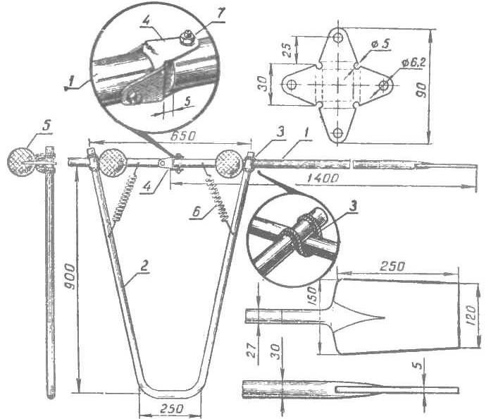 Àïïàðàò äëÿ ãðåáëè íîãàìè (íàæìèòå äëÿ óâåëè÷åíèÿ): 1 - âåñëî; 2 - ðàìà; 3 - øíóð; 4 - êàðäàííûé øàðíèð; 5 - ìÿ÷ äèàìåòðîì 150 ìì; 6 - ïðóæèíà óñèëèåì 6 êã