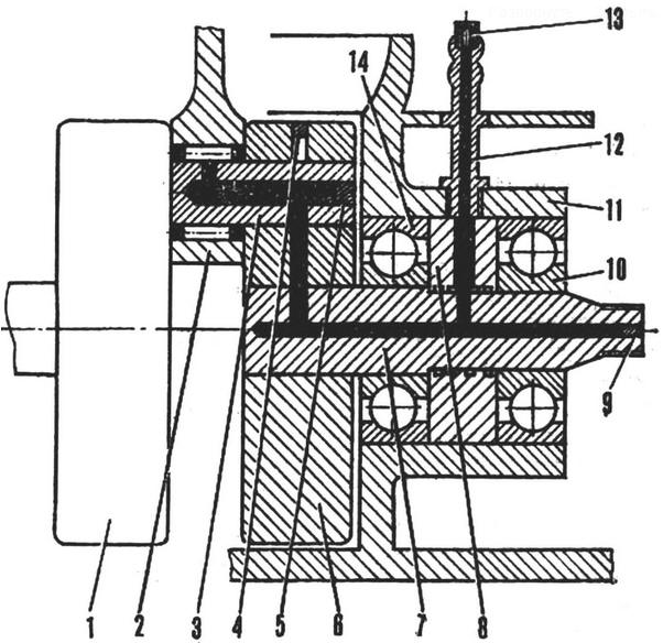 Схема модернизированного шатунно-кривошипного узла: 1 - щека кривошипа (правая), 2 - шатун в сборе с роликами, 3 - палец шатунный, 4, 5, 9 - заглушки, 6 - щека кривошипа (левая), 7 - коренная шейка кривошипа (левая), 8 - лабиринтное уплотнение, 10, 14 - подшипники, 11 - картер, 12 - штуцер подвода смазки, 13 - дозирующий жиклер