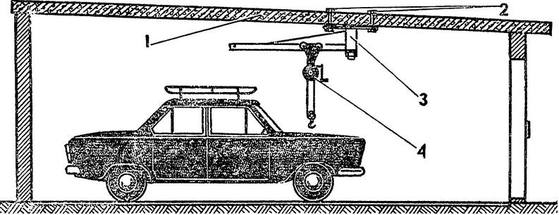 Ðèñ. 1. Ïîäúåìíèê â ãàðàæå: 1 - ïåðåêðûòèå, 2 - áîëòû Ì16 (4 øò.), 3 - ñòðåëà, 4 - ãðóçîâàÿ ëåáåäêà