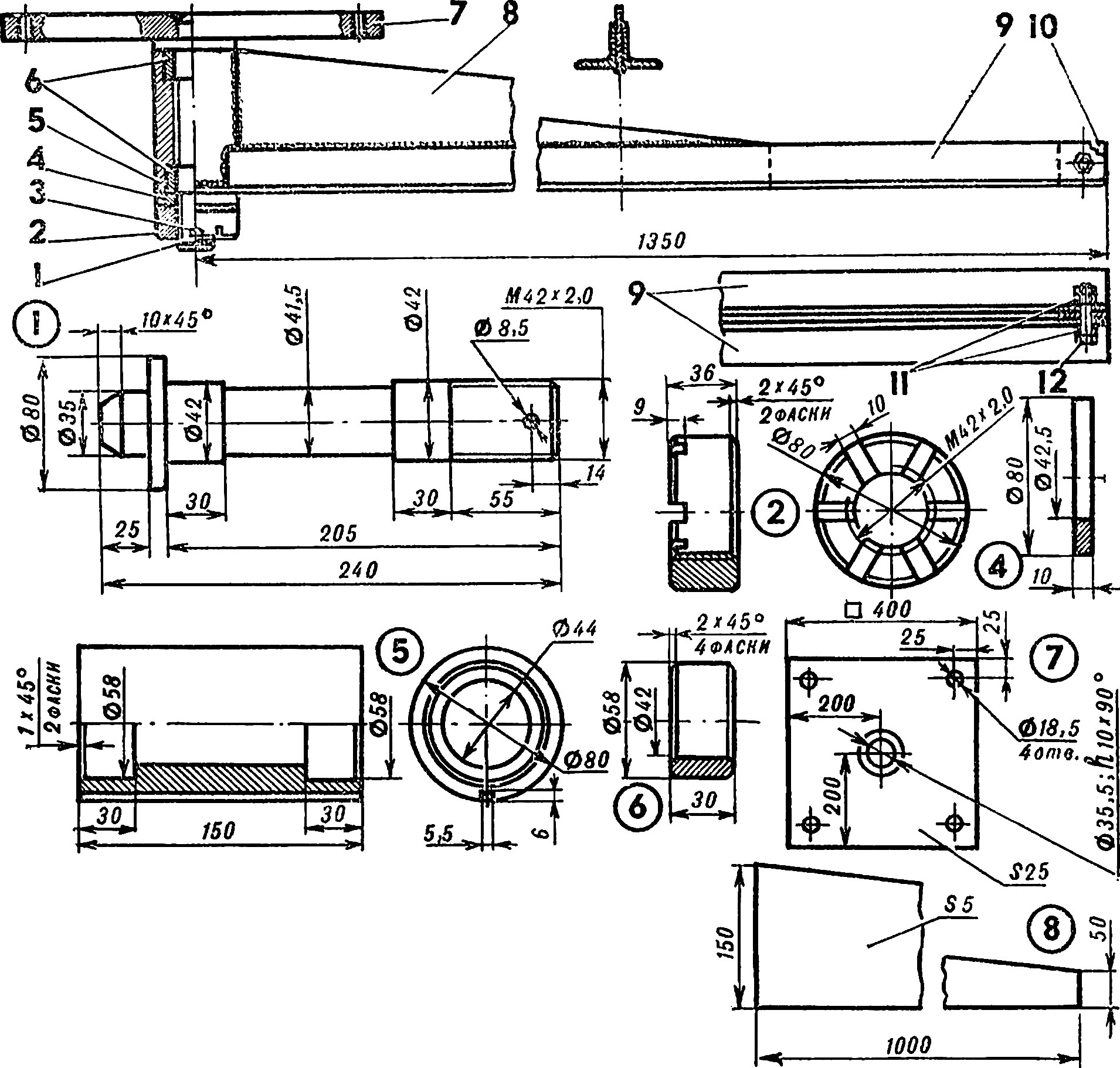 Ðèñ. 2. Êîíñòðóêöèÿ êðàíà (íàæìèòå äëÿ óâåëè÷åíèÿ): 1 - âàë, 2 - ôàñîííàÿ ãàéêà, 3 - øïëèíò, 4 - øàéáà, 5 - ñòàêàí, 6 - ïîäøèïíèêè ñêîëüæåíèÿ, 7 - îñíîâàíèå, 8 - ïîäêîñ, 9 - óãîëêè 50õ50 ìì, 10 - ïðîñòàâêà, 11 - óïîðíûå âòóëêè, 12 - áîëò-îãðàíè÷èòåëü