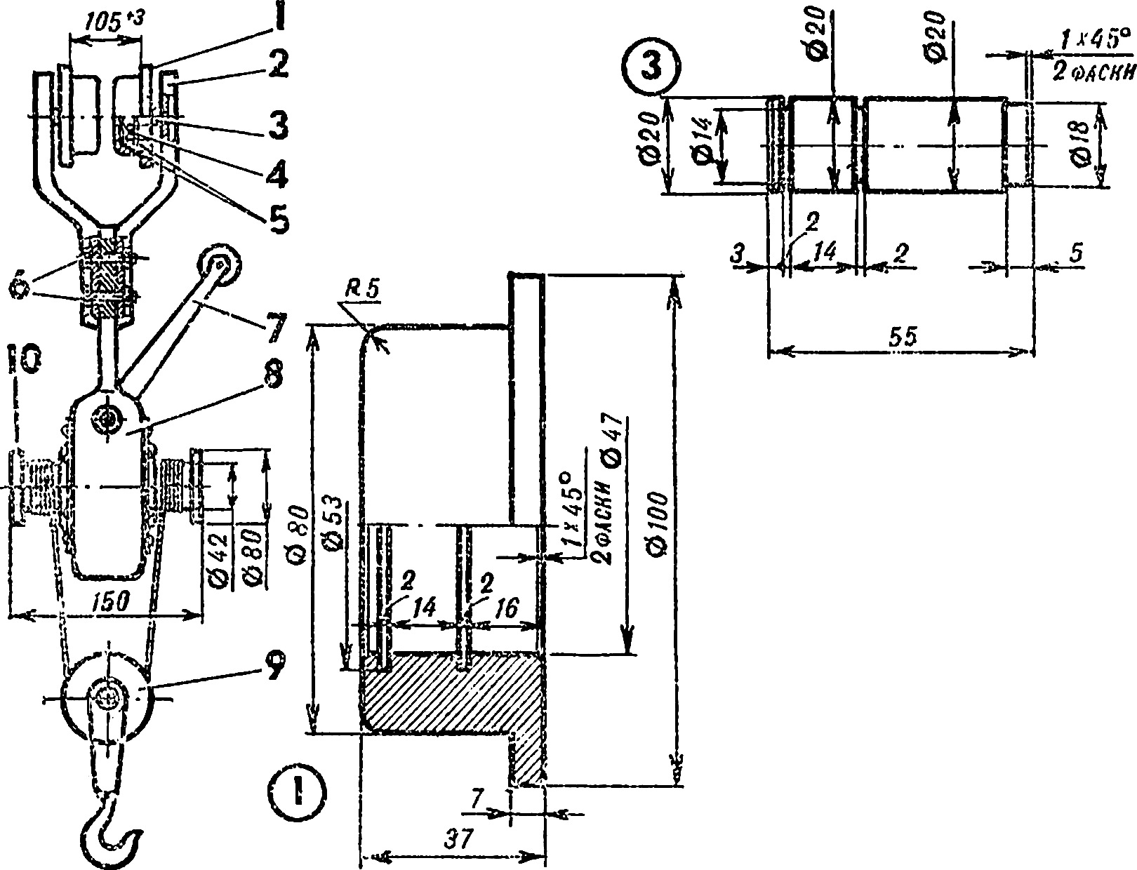 Ðèñ. 3. Ãðóçîâàÿ ëåáåäêà ñ òåëåæêîé (íàæìèòå äëÿ óâåëè÷åíèÿ): 1 - êîëåñî (4 øò.), 2 - ùåêà òåëåæêè, 3 - âàëèê, 4 - ïîäøèïíèê ¹ 204, 5 - ñòîïîðíûå êîëüöà, 6 - áîëòû Ì12, 7 - ðóêîÿòêà ïðèâîäà, 8 - ëåáåäêà, 9 - øêèâ ñ ãðóçîâûì êðþêîì, 10 - ðåáîðäà