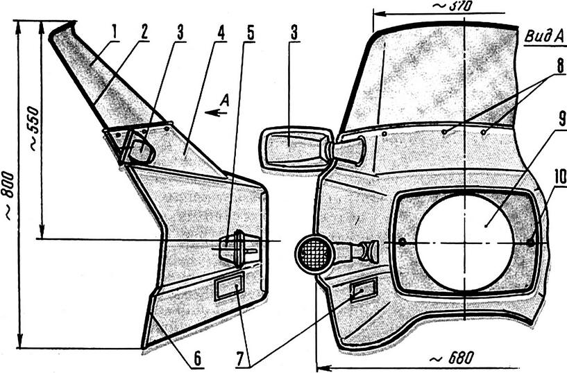 Ветрозащитный обтекатель для мотоцикла. Личный транспорт Справочник / Личный транспорт: наземный, водный, воздушный Общеизвестно, что ветрозащитный обтекатель - это вовсе не дань мотоциклетной моде и не только защита мотоциклиста от холода и грязи. Грамотно спроектированный щиток способствует повышению скорости двухколесной машины за счет снижения аэродинамического сопротивления. Ну а облику мотоцикла обтекатель придает логичность и законченность: благодаря ему мототранспортное средство обретает собственное лицо, выделяющее машину в ряду тысяч подобных. Многие мотоциклисты оснащают им свои двухколесные машины. Действительно, удачный ветровик существенно улучшает облик мотоцикла; сделанный же бездумно и вне всякой связи с его внешним видом превращает мотоцикл в нечто архаичное, допотопное. Хотелось бы поделиться конструкцией созданного мною обтекателя для своего мотоцикла. При выборе его дизайна я исходил из тех принципиальных черт, которые отличают мотоцикл "Ява-634" от машин более ранних выпусков. Именно поэтому явно просматриваются на моем ветровике ребра, которые, помимо всего прочего, повышают жесткость и прочность оболочки. Чтобы наклонить фронтальную плоскость лобового щита, пришлось отступить от плоскости разъема фары вперед. Это дало возможность сделать щит глубоким, хорошо обтекаемым, позволило разместить внутри его ящик для мелких вещей (перчаток, атласа, фото- или радиоаппаратуры и т.п.), защищенный от осадков. Задние срезы щитка выполнены параллельно основным линиям мотоцикла; верхняя часть среза параллельна перьям передней вилки, нижняя - передней части рамы. Это позволило получить внешний вид мотоцикла как нечто целостное, гармоничное. Обтекатель представляет собой конструктивно непрозрачную пространственную оболочку, выклеенную из композитных материалов и соединенную с прозрачным ветровым щитом из органического стекла. Боковины обтекателя имеют открывающиеся створки с регулируемым углом их отклонения. Устанавливая их в одно из фиксированных положений, можно уменьшить разрежение внутри обтекателя. А это прежде всего снижает так называемое донное давление, величина которого существенно влияет на Cx - коэффициент лобового сопротивления. К тому же снижение разрежения внутри обтекателя практически устраняет паразитные завихрения воздуха и уменьшает подсос пыли и водяных брызг. Верхняя (прозрачная) часть обтекателя имеет уменьшенную высоту, однако эффективность ветровой защиты из-за этого ничуть не ухудшилась: отогнутая часть щита уплотняет поток воздуха и фактически отклоняет его приблизительно в зону воздухозаборника-вентилятора мотошлема типа "интеграл" (кстати, также самодельного). Водитель же оказывается в застойной, достаточно комфортной зоне. Все это дало возможность ограничить высоту ветрового щита приблизительно уровнем подбородка мотоводителя, что позволило обеспечить оптимальный обзор вперед даже в тех случаях, когда погодные условия делают стекло непрозрачным.