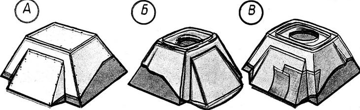 Лобовой обтекатель оснащен двумя зеркалами заднего обзора, корпуса которых также выклеены из композитных материалов. Сами же зеркала комбинированные: каждое панорамное и прямое. Внутренняя полость обтекателя оклеена черной искусственной кожей. К мотоциклу обтекатель крепится в четырех точках. Основные крепежные элементы - болты, с помощью которых в передней вилке закреплена фара. Вспомогательные - это стойки на руле мотоцикла и на шарнирах зеркал обтекателя. Кстати, величину наклона щита можно изменять, увеличивая или уменьшая высоту стоек. Прежде чем взяться за работу по выклейке обтекателя, нужно решить для себя, какой метод изготовления оболочки вы предпочитаете использовать: выклейку по болванке или выклейку в матрице. Достоинства и недостатки есть и у первого, и у второго способа. Работу по изготовлению обтекателя следует начать с его прорисовки в удобном масштабе. Далее из подручных материалов - картона, фанеры и пластилина - делается уменьшенная модель обтекателя, по которой уточняются его форма и размеры. Когда убедитесь, что получившаяся модель соответствует вашим конструкторским замыслам, можно переходить к изготовлению болванки обтекателя в натуральную величину. Выклейку по болванке начинайте с короба - фанерного ящика, который смог бы вписаться внутрь будущего обтекателя. Форма короба доводится в соответствии с эскизами и моделью. При этом можно использовать упаковочный пенопласт в сочетании с пластилином, гипс, алебастр или даже глину. Есть смысл сначала довести форму на половине обтекателя, до плоскости его симметрии, а затем с помощью картонных шаблонов воспроизвести вторую половину. Надо учесть, что болванка воспроизводит внутреннюю полость обтекателя, поэтому необходимо размеры ее занизить в соответствии с толщиной будущей оболочки - около трех миллиметров. Готовая болванка покрывается разделительным слоем - паркетной мастикой или консистентной смазкой (например, ЦИАТИМ) и оклеивается лоскутами стеклоткани, пропитанными эпоксидной смолой, тщательно размешанной с отвердителем в соотношении 8:1. При работе со стеклотканью и смолой надо пользоваться резиновыми перчатками, работать на открытом воздухе или у окна, на сквозняке. Выклейку лучше всего производить за один раз, не дожидаясь отверждения очередного слоя. После окончания выклейки оболочка отделывается эпоксидной шпаклевкой (смолой в смеси с тальком или зубным порошком), вышкуривается, грунтуется, а затем покрывается так называемым "проявочным" слоем краски. Подсвечивая оболочку матовой лампой, по отраженным бликам определяют правильность формы обтекателя. Отклонения от формы - перегибы, выпуклости, впадины - вышпаклевываются и вышкуриваются, после чего наносится второй проявочный слой краски, и операции повторяются.