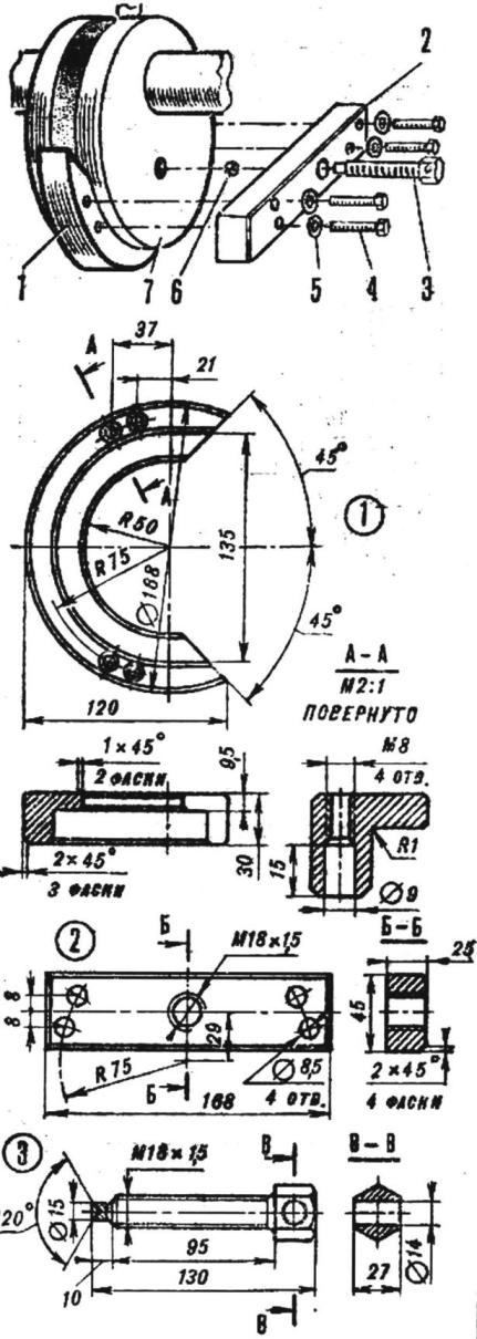 Детали приспособления для разборки коленвалов (нажмите для увеличения): 1 - корпус, 2 - планка, 3 - нажимной винт, 4 - болт М8х50, 5 - шайба, 6 - шарик, 7 - щека коленвала