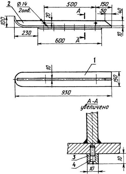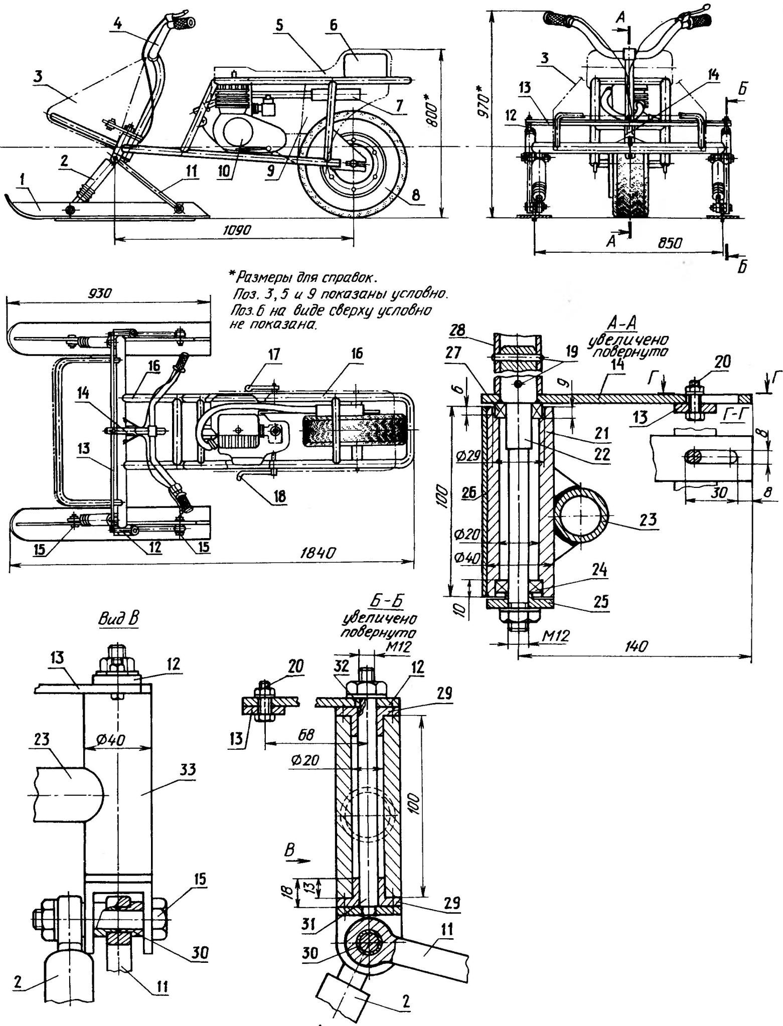 Точеные корпуса колонок приваривают к поперечной балке под углом 67° к плоскости, в которой расположены лонжероны. Крепление среднего корпуса для большей жесткости усилено охватывающей косынкой. Вал рулевой колонки вращается в двух подшипниках. Верхняя его часть вытачивается по внутреннему диаметру рулевой стойки и фиксируется в ней двумя штифтами. К этой же его части приваривается и сошка рулевого механизма. При повороте руля в ту или иную сторону она через планку разворачивает одновременно оба поводка передних опор. Поводки, укрепленные на рулевых валах опор с помощью шпонок, обеспечивают соответствующий угол разворота водил и лыж. В колонках опор вместо подшипников применены бронзовые втулки (можно установить капроновые или фторопластовые). Вал опоры имеет проушину, служащую для навески амортизатора и водила. Последние насажены на общую ось также через бронзовые втулки и шайбы. В качестве амортизаторов передних опор использованы стандартные мопедовские. Ведущее колесо устанавливается в специальные кронштейны из листовой стали, помещенные в прорези лонжеронов и затем приваренные к ним и стойкам рамы. Колесо взято от мотоколяски СЗД, но с уширенным ободом. Каким образом он уширяется, в наших публикациях уже рассказывалось. Если коротко, то здесь пользуются тем, что конструкция обода разборная и при необходимости, между его половинами дополнительно устанавливаются прокладки или проставки. На этот же обод ставятся тормозной барабан и ведомая звездочка. Последняя может быть как штатной от мотороллера "Турист", так и самодельной - все зависит от того, с какой максимальной скоростью вы собираетесь передвигаться на своем снегокарте. Двигатель крепится на раме за штатные передний и нижний узлы. Для этого на соответствующих поперечинах рамы привариваются ответные кронштейны. Чтобы обеспечить точность монтажа этих деталей, их предварительно закрепляют на моторе, который потом ставят на раму, и прихватывают кронштейны сваркой. После чего проверяют правильность их установки (ведущая и ведомая звездочки должны находиться в одной плоскости), снимают мотор с рамы и окончательно проваривают крепежные детали. Выхлопная труба и глушитель выводятся под сиденье. Там достаточно пространства для их размещения, и они оказываются в малодоступном и безопасном месте для водителя. Закрепляются они хомутами и бугелями. Лыжа снегокарта состоит из подошвы, ребра жесткости и подреза. Первые две детали вырезают из дюралюминиевого листа и сваривают между собой в среде аргона, желательно, чтобы третья была съемная. Это необходимо потому, что подрез довольно быстро изнашивается и его нужно периодически заменять или подтачивать. Кроме того, такая конструкция позволяет применять подрезы различной высоты - в зависимости от толщины снежного покрова и его состояния (свежевыпавший или плотный снег, наст или даже лед). Что касается ребра жесткости, то оно одновременно является и кронштейном, к которому крепятся амортизатор и водило. Изготовление сиденья не должно вызвать больших трудностей, так как в его основе лежит фанерный каркас, имеющий возвышения: в передней части - для прикрытия слегка выступающей над подрамником головки цилиндра, в задней - для бензобака. Каркас, оклеенный поролоном и обтянутый искусственной кожей, надежно крепится к 