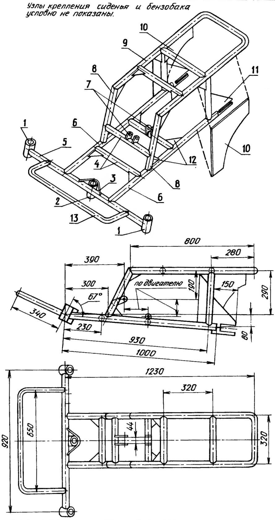 Снегокарт для спорта и отдыха. Личный транспорт Справочник / Личный транспорт: наземный, водный, воздушный В зимнее время года для любителей мотоспорта наступает период относительного затишья. Причиной тому- плохие условия, в которые попадает водитель, выехав на заснеженную, местами обледенелую дорогу на своем двухколесном друге. А по бездорожью можно проехать только на специально подготовленном (с шипованными колесами) мотоцикле. Использовав идею, предложенную Ю. Бауковым из Саратова, вы приобретете машину, отлично приспособленную для различных зимних видов спорта и отдыха. Она заменит и традиционный карт в кольцевых гонках на ровных площадках, и кроссовый мотоцикл в состязаниях по пересеченной местности, так как обладает завидной устойчивостью и проходимостью. При собственной массе около 70 кг снегокарт легко развивает скорость до 50 км/ч. Его можно эксплуатировать и летом, поставив вместо лыж колеса. Снегокарт - трехопорное колесно-лыжное транспортное средство с двигателем Т-200 от мотороллера "Турист". Это один из самых надежных отечественных двухтактных моторов, оборудованный принудительным воздушным охлаждением, мощным стартером и генератором. Пространственная сварная рама вездехода выполнена из стальных труб диаметром 32 мм и состоит из поперечной балки, на которой расположены корпуса колонок передних опор и руля, двух лонжеронов и подрамника сиденья, соединенных между собой парой стоек и подкосов. Кроме того, она усилена несколькими поперечинами и косынками, а также защищена от лобового удара дугой, одновременно служащей для установки щитка-обтекателя. Боковые щитки, частично закрывающие колесо, предназначены для исключения попадания в цепь или под колесо одежды водителя и укрепления консольной части подрамника сиденья. Чтобы упростить процесс сборки рамы и обеспечить большую точность его выполнения, лучше всего использовать простейший стапель, на котором жестко закрепляются все элементы рамы в соответствии с рабочим чертежом.