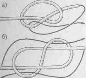 Íà ñõåìå äàíû äâà ñïîñîáà åãî âÿçêè. Ïåðâûé ñïîñîá (ðèñ. 5, à), îñíîâàííûé íà ïðîñòîì óçëå, ïðåäóñìàòðèâàåò ââîä õîäîâîãî êîíöà â ïåòëþ ñíèçó ìåæäó êîðåííûì è õîäîâûì êîíöàìè ñ ïîñëåäóþùèì ïðîïóñêîì åãî ïîä ñåáÿ. Âòîðîé ñïîñîá âÿçêè þôåðñíîãî óçëà (ðèñ. 5, á) ïðåäóñìàòðèâàåò çàâÿçûâàíèå âîñüìåðêè è ïðîòàñêèâàíèå îáîèõ êîíöîâ â ñîîòâåòñòâóþùèå åå ïåòëè, êàê ýòî ïîêàçàíî äâóìÿ ñòðåëêàìè.