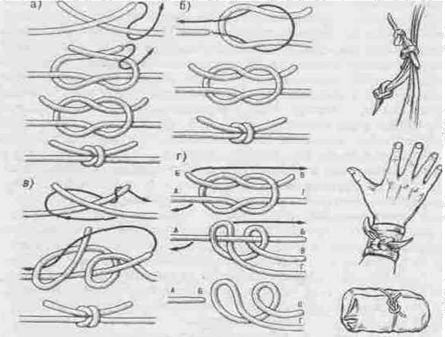 Прямой узел. Советы туристу Замечательный прямой узел достоин того, чтобы о нем рассказать подробнее. Археологические находки свидетельствуют о том, что примерно за пять тысяч лет до нашей эры им пользовались египтяне. Древние греки и римляне называли его Nodus Hercules - геркулесовым или геракловым узлом, потому что мифический герой Геракл так завязывал на своей груди передние лапы шкуры убитого им льва. Римляне применяли прямой узел для сшивания ран и при лечении переломов костей. Он представляет собой два полуузла, последовательно завязанных один над другим в разные стороны. Это обычный, самый простой способ его вязки (рис. 25, а). Моряки, которые этим узлом пользуются со времен глубокой древности для связывания тросов, применяют другой способ вязки (рис. 25, б). Ткачи, которые применяют прямой узел для связывания оборвавшихся нитей пряжи, завязывают его особым, удобным им способом (рис. 25, а). Автор книги берет на себя смелость заявить, что в толковании характеристики прямого узла и в рекомендациях по его применению, опубликованных во всех без исключения отечественных изданиях, была допущена грубая ошибка. Ее не исправили до сих пор, забыли о ней и уверовали в то, что этот узел "надежно служит для связывания двух тросов примерно одинаковой толщины" и что "его очень трудно развязать, если он затянется". Вот что сообщают нам о прямом узле современные морские справочники и учебники, изданные в нашей стране за последние годы. "Прямой узел применяется для связывания двух тросов примерно одинаковой толщины. При сильном натяжении и намокании прямой узел затягивается и развязать его бывает очень трудно. Поэтому при связывании прямым узлом толстых тросов в узел необходимо вставить "клевант" (Справочник по морской практике. М.: Воениздат, 1969, с. 192). Почти то же самое говорится о прямом узле в атласе В. В. Григорьева и В. М. Грязнова "Судовые такелажные работы" (М.: Транспорт, 1975, с. З): "Прямой узел применяют при связывании тросов примерно одинаковой толщины. При больших нагрузках на связанные тросы, а также при намокании тросов прямой узел сильно затягивает. Для предотвращения чрезмерного затягивания в петли узла вводят деревянный вкладыш". Мысль о том, чтобы прямым узлом брать рифы, сегодняшним морякам покажется абсурдной. Но именно им, прямым узлом, во времена парусного флота брали на судах с прямым вооружением рифы: двумя риф-сезнями привязывали верхнюю часть полотнища прямого паруса к риф-лееру. Рифовым же узлом брали рифы на малых судах (ялах, баркасах и яхтах), подбирая часть паруса вдоль нижней шкаторины, и связывали ее с риф-штертами. Несколько лет назад автор этих строк обратил внимание на тот факт, что почти во всех морских словарях и учебниках по морской практике, изданных в нашей стране в прошлом веке, узел, о котором идет речь, имел два названия - "прямой", и, как это ни странно, он же "рифовый". Для примера заглянем в "Объяснительный морской словарь", составленный В. В. Бахтиным и изданный в С.-Петербурге в 1894 году (с. 265-266): "Прямой узел или рифовый (Reef Knot; Right Knot) вяжется из двух концов. Сперва вяжут простой узел, потом конец, вытянутый правой рукой, передается в левую, а другой конец, взятый сверх первого, продевается под оный и обтягивается. Из этого видно, что рифовый узел состоит из двух простых узлов, вязанных один над другим. Соответствующие концы об