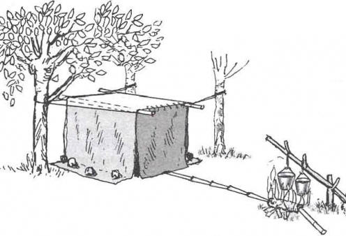 ...Вот определено место для привала, установлена палатка, а на необходимом удалении от нее уже потрескивают в огне сучья и развешиваются котелки для приготовления нехитрой туристской еды. Самое время позаботиться о теплой ночевке. Для этого в костер укладывается отрезок металлической трубы, концы которой выходят за пределы горящих полешек и раскаленных углей. К концу, который обращен в сторону палатки, подсоединяется уходящий в нее шланг или несколько трубчатых отрезков (диаметром и соединением по аналогии с пылесосом): по ним будет отводиться нагретый воздух от трубы в костре, а холодный станет засасываться в другой конец трубы. И чтобы его тяга была хорошей, желательно уложить "трубопровод" так, чтобы он шел по наклонной вверх к палатке: чем круче - тем интенсивнее поступление нагретого воздуха. Чтобы он был не слишком горячим, труба в костре может быть обмотана асбестом или обмазана глиной. Регулировать температуру поступающего в палатку воздуха можно, прикрывая или перекрывая любое из отверстий "трубопровода". Такое отопление вполне безопасно, его можно смело оставлять и на ночь, сколько будет гореть и тлеть костер.