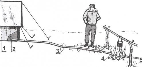 Отопление туристской палатки: 1-палатка; 2-выходной конец обогревающей трубы; 3-составные звенья "трубопровода"; 4-костровая труба; 5-входной конец трубы (воздухозаборник)