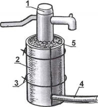 Теплоотвод от костра для отогрева замороженной водоразборной колонки: 1 - колонка; 2-чехол; 3-обвязка листов чехла; 4 - шланг теплоотвода от костра; 5-ветошь