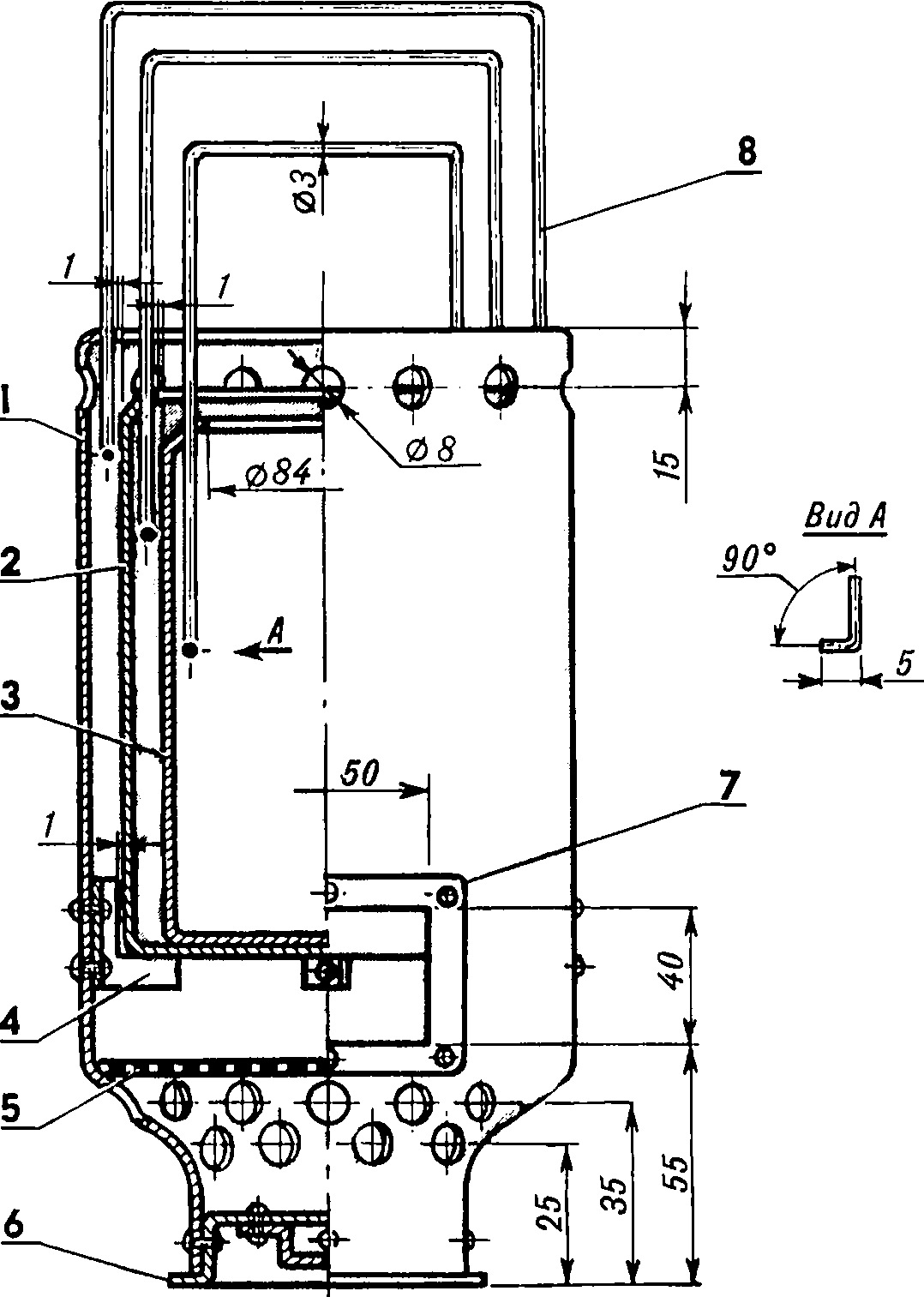 Рис. 1. Походная мини-кухня в собранном положении (крышки бачков не показаны): 1 - топочный корпус, 2 - бачок на 2 л, 3 - бачок на 1 л, 4 - упор (3 шт.), 5 - "колосник", 6 - крышка, 7 - накладка, 8 - ручка (3 шт.) (нажмите для увеличения)