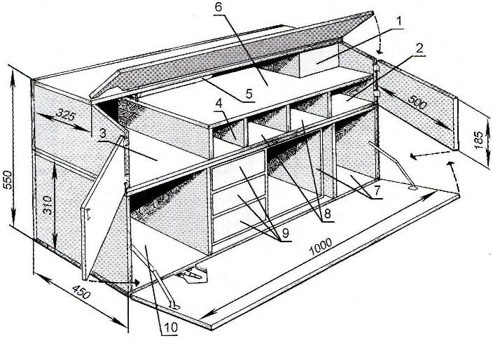 Автомобильный контейнер для продуктов (нажмите для увеличения): 1 - место для хлебницы; 2,8 - отделения для посуды и кухонной утвари; 3 - место для канистры с водой; 4 - отделение для пищевой пленки, фольги; 5 - рулон бумажного полотенца; 6 - отделение для пакетов с бутербродами; 7 - отделения для газовой плитки, термосов, продуктовых контейнеров; 9 - выдвижные ящики для столовых приборов, специй; 10 - отделение для бутылей с соком, напитками, водой
