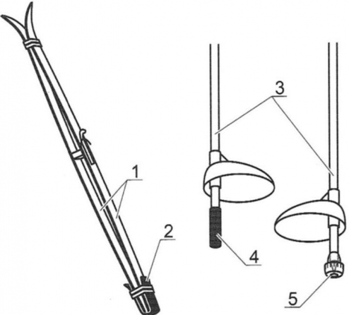 Çàùèòà ëûæíîãî êîìïëåêòà: 1 - ëûæè; 2 - ðåçèíîâûå íàñàäêè; 3 - ëûæíûå ïàëêè; 4 - çàùèòíûé íàêîíå÷íèê èç ðåçèíîâîé òðóáêè; 5 - íàêîíå÷íèê èç ïëàñòìàññîâîé ïðîáêè