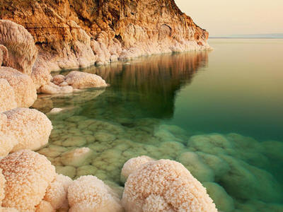 Причины высокой солености Мертвого моря понятны: Иордан и еще несколько небольших речек и ручьев веками несут воду в это бессточное озеро, там она частично испаряется, а соли накапливаются. В результате сейчас можно спокойно лежать на поверхности озера с книгой: густой плотный рассол не даст вам утонуть. Но обычное купанье в этом уникальном водоеме невозможно: ни нырнуть, ни поплыть, разве что посидеть или вытянуться на воде во весь рост. Зато он превосходно лечит болезни кожи и обладает многими другими целебными свойствами. Побережье Мертвого моря является самым низким местом на суше нашей планеты и лежит на четыреста метров ниже уровня мирового океана. Между прочим, в прошлые геологические эпохи уровень воды в озере был гораздо выше, о чем свидетельствуют морские отложения, обнаруженные на склонах впадины Эль-Гор. Но по мере того, как климат делался все более жарким, испарение усиливалось, воды в Мертвом море оставалось все меньше, а соленость ее росла. Добавляют солей в озеро и горячие минеральные источники, бьющие на южном берегу Мертвого моря. Сегодня поверхность суперсоленого озера даже внешне не напоминает водную. Густая маслянистая на вид жидкость с металлическим отливом и желтовато-белыми хлопьями соли на мелких местах, она даже в разгар летней жары не вызывает желания окунуться. Впрочем, мы уже знаем, что это все равно невозможно, тем более что разъедающие свойства рассола вряд ли добавят купальщику удовольствия. Так что "купание" (а точнее, лежание или сидение) в Мертвом море - удел любителей экзотических фотоснимков, либо людей, которым это прописал врач-дерматолог. Лечебные качества озерного рассола были известны давно. Еще библейский царь Ирод Великий лечился ваннами из воды-Мертвого моря. Теперь же это проведение целебных процедур поставлено здесь на широкую ногу, и целая сеть отелей на побережье принимает страждущих со всего мира, предоставляя им возможность лечиться рассолами и грязями со всем возможным комфортом. Река Иордан, та самая, в которой Иоанн Предтеча окрестил Иисуса, впадает в Мертвое море с севера, поэтому вода в этой части озера более пресная - "всего" 240 граммов солей в литре. Чем дальше на юг, тем вода солонее, а на самой южной оконечности из высыхающего пересыщенного рассола образуются даже своеобразные "соляные столбы" самого причудливого облика. Один из них, напоминающий своими очертаниями женскую фигуру в плаще, связан с библейской легендой. Он называется "жена Лота". Все, наверное, помнят, что, собираясь покарать погрязшие в разврате Содом и Гоморру, Бог предупредил об этом праведника Лота, и тот ушел с женой из города накануне его разрушения. Но жена праведника, нарушив запрет Господа, оглянулась, уходя, на родные стены, за что и была превращена в соляной столб. Многое еще напоминает на берегах Мертвого моря о библейских временах. Это и возвышающиеся на высокой скале западного берега, напротив полуострова Эль-Лисан, развалины неприступной крепости Мецада, построенной еще Иродом Великим, и священный Иордан, и древний город Хеврон, и таинственные пещеры Кумрана, где недавно найдены уникальные рукописные свитки 2000-летней давности, повествующие о событиях, связанных с началом христианства. Но главная достопримечательность здесь, конечно, Иерусалим - город, равно чтимый приверженцами трех рели