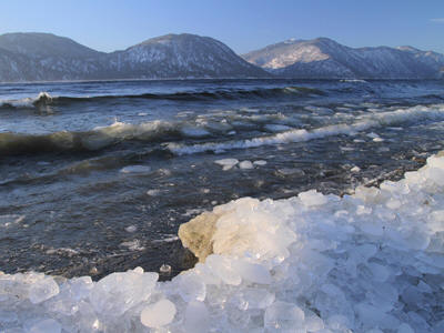 Телецкое озеро. Чудо природы В первые осенние холода в воде Телецкого озера образуются маленькие очаги ледяных кристаллов, которые растут на глазах. Появляются тончайшие льдинки; смыкаясь краями, они звенят и шуршат. За несколько часов при морозной погоде озерная ширь затягивается тонким, как пленка, льдом. Этот первый лед алтайцы называют "карамыс". Если же наутро начнется "верховка", она ломает его начисто, мельчит в крошки, а волны громоздят на берегу голубоватый, словно из битого стекла, ледяной вал. Но достаточно суток без ветра, чтобы лед окреп, и тогда никакая волна его не берет. Он только изгибается в такт ей, иногда трескается, но уже не крошится.