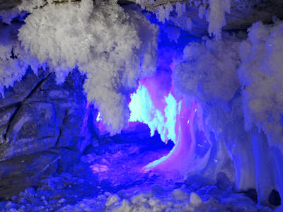 Пещер в России много - и горных, и равнинных. И эта уральская красавица вроде бы не самая выдающаяся из них. В Сибири и на Кавказе, в Поволжье и Сихотэ-Алине известны подземные полости и побольше, и поглубже Кунгурской. В чем же уникальность "уральского чуда", почему вот уже два столетия не иссякает поток людей, стремящихся увидеть эту окаменевшую сказку, укрытую в недрах уральских гор? Дело в том, что редкостное сочетание рельефа, климата и карстовых процессов привело здесь к образованию совершенно необычной по облику пещеры. Все подземные дворцы нашей планеты красивы по-своему, будь то в Пиренеях или Динарах, в Крымских горах или в Новой Зеландии. Но жемчужина Урала выделяется из общего ряда своим необычным морозным ледяным нарядом, равного которому нет ни в одной из знаменитых пещер мира. Находится Кунгурская пещера на Среднем Урале, на правом берегу реки Сылвы, самого красивого притока реки Чусовой. Эта длинная, почти шестисоткилометровая река берет начало на восточном, азиатском склоне Урала, недалеко от Екатеринбурга. Единственная из уральских Рек, она сумела пропилить древний горный хребет и сквозь череду скалистых ущелий и каменных "ворот" прорваться на Европейскую равнину к широкой полноводной Каме. Когда-то по Чусовой поднимались струги славной дружины Ермака, шедшего покорять Сибирь. А со времени Петра Первого, когда заводчики Демидовы положили начало уральской металлургии, стала Чусовая рекой-труженицей. В течение двух столетий это был главный транспортный путь через Урал, и миллионы пудов железа, чугуна и меди вынесла Чусовая к камским пристаням. До появления железных дорог ежегодно до пятисот барж отправлялись с уральских заводов вниз по реке до Перми. Они перевозили за период весеннего половодья по семь миллионов пудов металла. Пятьсот километров сплава по бурной реке караван проходил за пять-шесть дней. Десятки опасных утесов - Олений, Высокий, Разбойник и другие, сотни подводных камней, перекатов и стремнин, где скорость течения достигала тридцати километров, поджидали сплавщиков. Десятки барж разбивались каждый год на Чусовой, гибли люди и ценные грузы... Река Сылва впадает в Чусовую слева перед самым слиянием ее с Камой, в районе города Перми. А в двухстах километрах выше устья Сылвы стоит древний городок Кунгур, основанный почти четыре века назад как крепость для отпора разбойным набегам из Сибирского ханства. Окрестности Кунгура богаты достопримечательностями. В полусотне километров к югу от него раскинулся курорт Ключи, знаменитый своими целебными сероводородными водами. Еще в XVI веке писал о них чердынский воевода царю Ивану Грозному, как о "чуде, яко бьющем из-под земли". Чуть дальше, на горе Дубовой, находится Нижнеиргинская дубовая роща - самая северная на Урале, да и во всей России. Посредине рощу разрезает Юлайкин лог, в котором, по преданию, останавливался со своим отрядом пугачевский сподвижник Салават Юлаев. А в старинном заводском поселке Суксун, где когда-то был построен первый в России железный пароход, стоит на холме совершенно необычное для Урала здание - дворец, напоминающий средневековый замок. Эта прихоть чудаковатого миллионера Каминского вот уже сто лет украшает здешний пейзаж, неизменно привлекая внимание путешественников. Но главное, что принесло славу и известность Кунгуру - коне