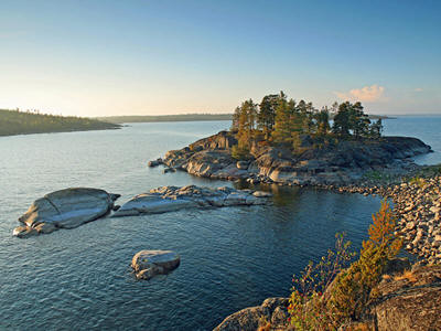Огромное озеро, самое большое в Европе, раскинулось на площади величиной с пол-Швейцарии у самого края Балтийского щита - гранитной макушки Русской равнины. С юга на север протянулось оно на двести двадцать километров, а в ширину достигает восьмидесяти. Почти тысяча кубических километров воды хранится в его озерной чаше - втрое больше, чем в соседнем Онежском озере. Ведь глубина Ладоги местами превышает двести метров! Нечасто встретишь озеро, берега которого так разнообразны. Северо-западное побережье - скалистое, изрезанное глубокими узкими заливами, чем-то напоминающими норвежские фьорды в миниатюре. На десятки метров поднимаются над водой гранитные и гнейсовые громады утесов, поросших лесом. Заливы (или, по-местному, "губы") и выходы из них на озерный простор усеяны сотнями мелких, но высоких каменистых островков - шхерами. Их на озере более шестисот, но относительно крупных всего пять-семь: Риеккалансари, Мантсинсари, Лункулансари, Кильпола, Валаам, Коневец. Многочисленные островки шхер всегда возвышенны, скалисты и покрыты сосновым лесом. Когда плывешь по озеру, они возникают на горизонте, как взъерошенные ежи. Почти все острова жмутся к северному берегу, лишь Валаамский архипелаг раскинулся ближе к середине озера. Самый большой остров этого архипелага знаменит своим древним монастырем, основанном новгородцами еще в XIV веке. Скалистые берега Валаама (его размеры - шесть на десять километров) круто, почти отвесно, опускаются в воду и уходят на полтораста метров в глубину. С северной стороны в Валаам врезается Монастырская бухта, в которую ведет длинный, узкий и глубокий проход между скалами. Здесь и располагается святая обитель. Вокруг главного острова рассеяно еще с полсотни мелких, но не менее живописных островков. Уникальная красота архипелага: бронзовые мачтовые сосны на гранитных куполах скал и памятники старины привлекают сюда множество туристов, а в последние годы, после возвращения монастыря Русской православной церкви, на Валаам, как в былые времена, потянулся и поток паломников. А в южной части озера есть необычный маленький островок Сухо - единственный здесь остров искусственного происхождения. На его месте находилась прежде опасная мель, немало досаждавшая капитанам ладожских судов. В XVIII веке по приказу Петра I на отмель насыпали каменные глыбы, соорудив рукотворный остров, и на этой насыпи возвели маяк, который служит судоводителям до наших дней. Северо-восточный берег Ладоги - совсем иной. Здесь он ниже, скалы перемежаются песчаными участками, а от города Олонец до впадения реки Свирь тянется пятидесятиметровой ширины пляж с дюнами, поросшими сосновым лесом. Юго-западные и южные берега озера тоже низкие, но покрыты галькой и валунами. Здесь кое-где встречаются заросли камыша и тростника, поскольку эта часть Ладоги - самая мелкая. В давние времена, еще с IX века. Ладожское озеро являлось частью важного торгового маршрута - Пути из варяг в греки. Уже тогда у впадения в озеро реки Волхов возникло поселение под названием Ладога. В XII веке здесь была сооружена каменная крепость, сохранившаяся до наших дней. Интересно, что само озеро до XVIII века никогда не именовалось Ладожским, а носило название Нево. Лишь позднее Ладожская крепость дала свое имя озеру. Зимой огромная чаша воды замерзает не сразу. Образующиеся по к