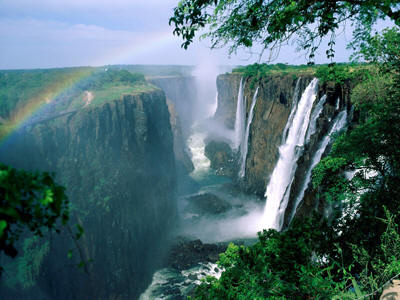 Моси-о-Тунья - "Гремящий дым" - так с давних пор называли охотники племени батока водопад на реке Замбези. А живущие на противоположном берегу скотоводы-матабеле дали ему другое, не менее поэтичное имя - Чонгуэ, что на их языке означает "Место радуги". Современное название - Виктория - дал водопаду в честь своей королевы первый европеец, увидевший его в 1855 году, англичанин Давид Ливингстон. Он обнаружил это чудо природы после двухлетнего трудного путешествия по саваннам и джунглям Центральной Африки. Сопровождавшие исследователя триста воинов местного вождя Селекту не решились приблизиться к ревущей громаде. По их мнению, в пропасти под кипящей стеной воды обитало грозное божество, дававшее знать о себе ужасающим рычанием. Лишь два самых смелых спутника Ливингстона отважились сесть с ним в челнок и доплыть до островка, находящегося на гребне водопада. Но предоставим слово самому путешественнику: "Перед нашими взорами предстали огромные столбы "пара", поднимающиеся вверх в пяти-шести милях от нас. "Пар" поднимался пятью столбами и, отклоняясь в направлении ветра, имел такой вид, как будто эти столбы касались низкого обрыва, покрытого лесом. На таком расстоянии казалось, что вверху столбы смешиваются с облаками. Внизу они были белыми, а выше становились темными, как дым. Вся эта картина была чрезвычайно красива. Водопад с трех сторон ограничен обрывами около 100 м высотой, которые покрыты лесом.