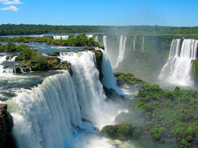 Национальные парки в двух государствах были созданы в разное время. Парк в Аргентине, в провинции Мисьонес, был создан в 1909 году, а в Бразилии, в штате Парана, - лишь в 1939-м. Примечательно и другое: три самых известных водопада в мире составляют границу между двумя странами. Так, на водопадах Виктория проходит граница между Северной и Южной Родезией. На Ниагарский водопад посетители ходят смотреть как с канадского берега, так и из Соединенных Штатов. По Игуасу тоже проходит граница, установленная двусторонним договором 1903 года между Бразилией и Аргентиной и дополнительным протоколом 1904 года. Окончательно граница была учреждена только в 1928 году. Охраняются растительность субтропического леса и различные животные (ягуар, оцелот, тапир, водосвинка и др.). Главной достопримечательностью национального парка является чудо природы Латинской Америки - водопад Игуасу, один из наиболее зрелищных в мире. Он находится на расстоянии 26 км от места впадения реки Игуасу в реку Парана. Река Парана, или Мать моря, протяженностью 4880 км, берет начало в Бразилии. Она течет на юго-запад и рядом с городом Гуаира образует участок естественной водной границы между Бразилией и Парагваем (расстояние 180 км). Здесь она сливается с рекой Игуасу. Дальше к югу Парана течет вдоль границы между Парагваем и Аргентиной, в Аргентине впадает в залив Ла-Плата. Водопад Игуасу относится к наименее доступным в мире, поэтому довольно долго европейцы не знали о его существовании. Этот водопад открыл дон Альвар Нуньенс Кабеса де Бака в 1541 году, когда отправился из Санта-Катарины, расположенной на побережье Атлантики, в глубь материка, в царство инков. По дороге он услышал в чаще лесов шум большой воды и пошел на этот звук. Его имя вытесано на каменной плите недалеко от узкого мостика над водопадом Аррайагарай. Испанский путешественник и не подозревал, что на языке гуарани "и" означает "вода", а "гуасу" - "большой". А окрестил открытое им чудо в Южной Америке Salto de Santa Marja. Намного позже, лишь в XVII веке, увидели великие воды миссионеры-иезуиты. Водопады Святой Марии на них не произвели, по-видимому, большого впечатления, так как они отправились дальше. Только в 1892 году была составлена первая более или менее подробная карта окрестностей водопада, и мир начал знакомиться с этим чудом природы. Водопад Игуасу имеет форму подковы (Аргентинская Подкова), а кому-то водопады Игуасу напоминают косу, обращенную к западу, потому что вода рек подходит к скалистому подковообразному барьеру и низвергается с него 275 потоками и струями. Их разделяют скалистые острова, покрытые пышной тропической растительностью. Вода спадает каскадом в ущелье с двух отвесных базальтовых ступеней шириной до 4 км (такой полноводный поток река Игуасу образует непосредственно перед водопадом). Некоторые из потоков падают вниз на глубину до 82 м, общая ширина каскадов водопада 2700 м. Мельчайшие капли образуют в воздухе водную пыль и сверкают на солнце всеми цветами радуги. Как падает вода с отвесной скалы, слышно за много километров по всей округе. И. Ганзелка и М. Зикмунд пишут: "Водопады Игуасу, несмотря на свои размеры и мощность, производят впечатление хрупких. Они капризны, как маркизы времен рококо. На земле нет места, откуда можно было бы увидеть их все сразу. Они играют в прятки, как школьники. Скрываются за скалой и вдр