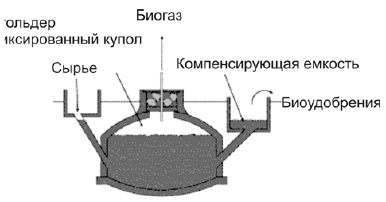 Установки с плавающим куполом состоят обычно из подземного реактора и подвижного газгольдера. Газгольдер плавает или прямо в сырье или в специальном водяном кармане. Газ накапливается в газгольдере, который поднимается или опускается в зависимости от давления газа. Газгольдер поддерживается специальной рамкой от опрокидывания. Если газгольдер плавает в специальном водном кармане, он предохранен от опрокидывания. Преимуществами этой конструкции являются легкость ежедневных операций, легкость определения объема газа по высоте, на которую поднялся газгольдер. Давление газа является постоянным, и определяется весом газгольдера. Строительство установки с плавающим куполом нетрудное, и ошибки в конструкции обычно не ведут к большим проблемам в получении газа. Недостатками такой конструкции являются высокая стоимость стального реактора и высокая чувствительность железа к коррозии. Поэтому, установки с плавающим куполом имеют меньший срок службы, чем установки с фиксированным верхом. В прошлом, установки с плавающим куполом строились в основном в Индии. Такие установки состоят из цилиндрического или куполообразного кирпичного или бетонного реактора и плавающего газгольдера. Газгольдер плавает в специальном водяном кармане или прямо в сырье и имеет внутреннюю или внешнюю раму, которая обеспечивает стабильность и сохраняет газгольдер в вертикальном положении. При выработке биогаза, газгольдер всплывает выше, при использовании газа, он опускается. Такие установки используются, в основном, для переработки навоза, органических отходов и фекалий в режиме постоянной, т.е. ежесуточной загрузки. Чаще всего они строятся на фермах среднего размера (реактор: 5-15 м3) или в больших агро-индустриальных комплексах (реактор: 20100 м3). Горизонтальные и вертикальные установки Выбор расположения реактора установки зависит от метода загрузки и наличия свободной территории в хозяйстве. Горизонтальные установки выбирают для непрерывного метода загрузки сырья и при наличии достаточного места. Вертикальные установки больше подходят для порционной загрузки сырья и используются при необходимости для уменьшения места, занимаемого реактором. Подземные и наземные установки При выборе расположения установки нужно учитывать топографию и пользоваться ею для оптимизации работы установки. Например, очень удобно располагать установку на склоне, чтобы загрузочное отверстие находилось достаточно низко, сырье в реакторе перемещалось за счет легкого наклона к выгрузочному отверстию, которое находилось бы на небольшой высоте для удобства загрузки в транспортные средства. Еще один фактор, который нужно учитывать при выборе установки, это улучшенная теплоизоляция подземных установок, включающая слабое влияние суточных изменений температуры на процесс сбраживания сырья, так как температура почвы на глубине более 1 метра практически не изменяется. Металлические, бетонные и кирпичные реакторы Установки можно различать по материалам, из которых изготовляется реактор. Бетонные реакторы обычно сооружаются под землей. Бетонный реактор имеет цилиндрическую форму, и небольшие установки (до 6 м3) могут изготовляться на конвейерной основе. Необходимы специальные меры для герметизации реактора. Преимущества: Низкие затраты на сооружение и материа