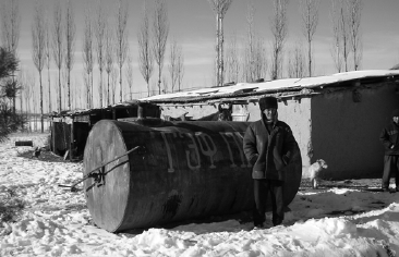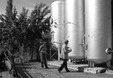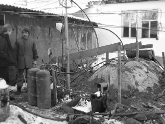 Загрузка и выгрузка сырья сопряжена с трудностями из-за непродуманной конструкции установки. Сырье перемешивается вручную один раз в день с помощью установленной в реакторе мешалки. Газ обычно используется напрямую для приготовления пищи. Пример 1: Примером такой установки может служить биогазовая установка Дуйшенова Фархата в с. Кызыл-Чарба Таласской области Кыргызстана (Рис 18.1). Установка была построена на грантовые средства ГЭФ ПРООН в 2003 году с целью получения биогаза для отопления и приготовления пищи и получения жидких органических удобрений из навоза 2 КРС хозяйства, овечьего и птичьего навоза соседних хозяйств. Установка состоит из одного надземного реактора без подогрева объемом 5 м3 с ручной загрузкой, выгрузкой и перемешиванием сырья. После монтажа весной 2003 года установка была загружена 3 тоннами сырья и работала в психофильном режиме в течение летних месяцев. Биогаза в летнее время хватало только на приготовление пищи. Выгрузка и загрузка сырья с 2003 года не производилась. Конструктивные недостатки включают недоработку системы ручного перемешивания, крайнее неудобство загрузки и выгрузки сырья. Отсутствие изоляции и обогрева реактора делают установку непригодной для круглогодичной эффективной работы и невыгодной экономически.