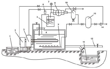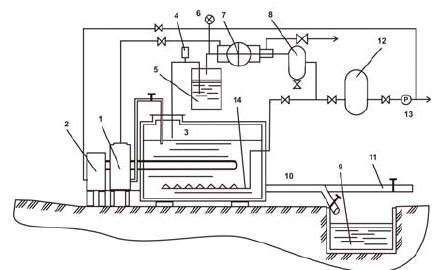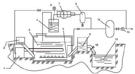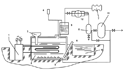 Подготовка, загрузка и перемешивание сырья механизированы и производятся с помощью пневматической системы. Подогрев сырья в реакторе биогазовой установки производятся с помощью теплообменника с водонагревательным котлом, работающим на биогазе. Трубопровод выгрузки сырья имеет разветвление для сбора биоудобрений в хранилище и для загрузки в транспортные средства для вывоза на поле. Устройство этой биогазовой установки (рис. 32) предусматривает ручную подготовку и пневматическую загрузку сырья в реактор, часть вырабатываемого биогаза используется для подогрева сырья в реакторе. Перемешивание производится биогазом. Отбор биогаза производится автоматически. Биогаз хранится в газгольдере. Установка может работать в любом температурном режиме сбраживания сырья. Биогазовая установка с газгольдером, механической подготовкой, пневматической загрузкой и перемешиванием сырья, с подогревом сырья в реакторе Отличительной особенностью этой биогазовой установки (рис. 34), предназначенной для средних и крупных крестьянских хозяйств, является наличие специальной емкости для подготовки сырья, откуда оно подается при помощи компрессора в бункер загрузки, а затем с помощью сжатого биогаза - в реактор установки. Для работы системы обогрева используется часть вырабатываемого биогаза. Установка снабжена автоматическим отбором биогаза и газгольдером для его хранения. Наличие системы обогрева позволяет эксплуатировать биогазовую установку во всех режимах сбраживания.