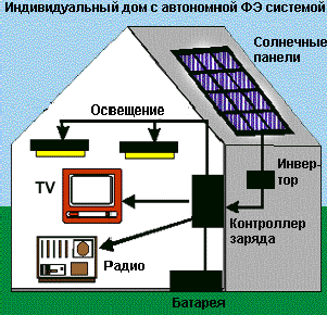 ЭНЦИКЛОПЕДИЯ РАДИОЭЛЕКТРОНИКИ И ЭЛЕКТРОТЕХНИКИ >Домашняя фотоэлектрическая система с аккумулятором. Энциклопедия радиоэлектроники и электротехники Энциклопедия радиоэлектроники и электротехники / Альтернативные источники энергии Солнечная система с аккумуляторами может питать много приборов при условии, что их энергопотребление не превышает мощности генератора. Поэтому необходимо правильно определить мощность системы. Первый шаг в этом направлении - составление спецификации, т.е. технического описания системы. Расчет энергопотребления При проектировании домашней фотоэлектрической системы сначала нужно составить список всех электроприборов в доме, выяснить их потребляемую мощность и внести в список. В таблице внизу даны для справки данные о средней потребляемой мощности некоторых приборов. Однако необходимо помнить, что это всего лишь приблизительные оценки. Чтобы рассчитать потребляемую мощность (E) системы с инвертором (для приборов переменного тока), нужно внести поправку (умножить среднее потребление на коэффициент C, чтобы получить общую мощность).