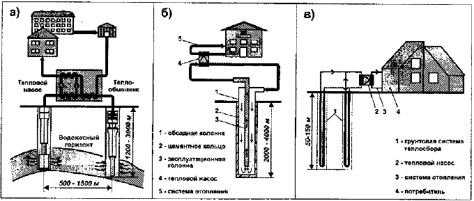 Оценка геотермальных технологий, применяемых в мировой практике показывает, что с их помощью может быть обеспечен широкий спектр потребителей тепловой энергии: от городского микрорайона до индивидуального дома. На основе геотермальных циркуляционных систем (ГЦС), состоящих из дублета глубоких (до 1,5 - 2,5 км) скважин, применяя тепловые насосы и пиковый догрев, получают высокотемпературные режимы отопления (90°C и выше) с тепловой мощностью до нескольких десятков МВт. Технология грунтовых тепловых насосов на скважинах 50 - 150 м соответствует среднетемпературным и низкотемпературным режимам, для коммерческих (магазины, офисы и др.) и муниципальных (школы, больницы и др.) приложений и объектов ЖКХ, при мощности до 0,1-0,4 МВт. На рис. 6.4 приведены схемы теплоснаюжения геотермальной водой.