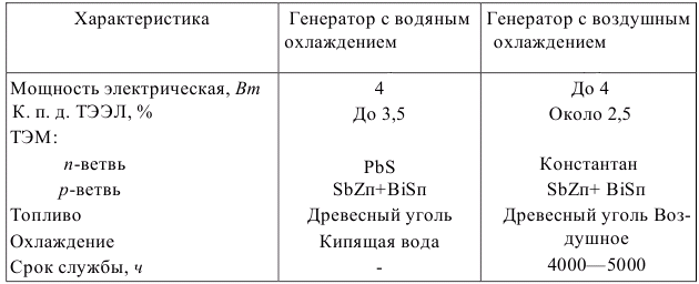 В ТЭГ имеются две независимо работающие батареи ТЭЭЛ: одна для питания цепей накала, другая - для питания (с помощью вибропреобразователя) анодных и сеточных цепей. Недостатки такого ТЭЭЛ: сложность осуществления теплового контакта между ТЭЭЛ и холодильником, наличие кипящей воды и трудность управления угольной топкой.