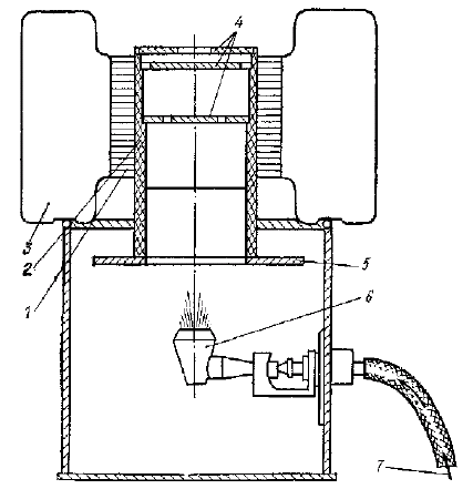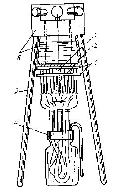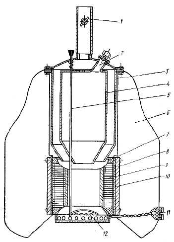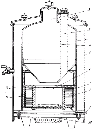 Таблица 7.1. Характеристики ТЭГ на древесном угле ТЭГ с нагревом горячих спаев за счет сжигания древесного угля и охлаждением холодных спаев кипящей водой (см. рис. 7.4, 7.5) имеет чугунную топку 6, в которой происходит горение угля, загружаемого в бункер 4 через горловину 1. Продукты сгорания уходят через трубу 2. В пространстве между внутренним кожухом 3 и наружным кожухом 5 находится кипящая вода, которая поддерживает температуру холодных спаев ТЭЭЛ около 100°C. Термоэлементы 8 электрически изолированы от конструкции установки тонкими слоями слюды. Тепловой контакт между кожухом 3 и ТЭЭЛ осуществляется легкоплавким сплавом, залитым между ними.