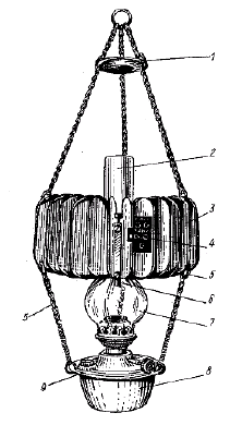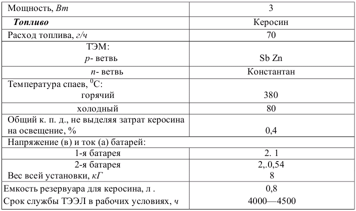 Здесь 145 термоэлектрических элементов из проволоки диаметром 0,5 мм заделаны холодными концами в дно бакелитового стакана диаметром 5 см, поддерживаемого треножником. Горячие концы элементов нагреваются пламенем обычной спиртовой горелки. Одна ветвь ТЭЭЛ из константана, другая - из сплава никеля (91%) с молибденом (9%). Выходное напряжение генератора 6 В. Эта схема очень напоминает схему ТЭГ-1, но в другом конструктивном исполнении: с металлическими ТЭЭЛ и заменой костра спиртовой горелкой. 2. Термоэлектрогенераторы на жидком топливе ТЭГ на керосине типа ТГК-1, ТГК-3 и ТГК-2-2-ТЭГ на керосине основаны на применении в качестве источника тепла обычных осветительных керосиновых ламп и наряду с получением электроэнергии являются источниками света. Конструктивные схемы ТГК-1, ТГК-3 и ТГК-2-2 одинаковы: раскаленные продукты сгорания керосина нагревают горячие спаи ТЭЭЛ из SbZn и константана, холодные спаи имеют ребра воздушного охлаждения. Мощность ТГК-1 около 1,6 Вт, ТГК-3 около 3 Вт. Основные характеристики ТГК-3 указаны в табл. 7.2. Таблица 7.2