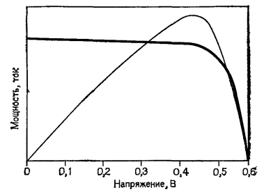 Как только сопротивление нагрузки станет равным нулю, напряжение упадет до нуля. Кстати, короткое замыкание фотоэлектрического преобразователя не приводит к выходу его из строя. Сила тока, которую может развить элемент, зависит от интенсивности света. Для первого измерения мы произвольно выбрали самый высокий уровень облученности, которому соответствует верхняя кривая (рис. 1). Каждая следующая кривая была получена на том же элементе при постепенном снижении интенсивности света. Кривая мощности Если необходимо построить график зависимости выходной мощности от напряжения, то в результате можно было получить нечто подобное изображенному на рис. 3. На одном конце графика имеется максимальный ток при нулевом напряжении. Конечно, никакой мощности в этой точке не выделяется из-за отсутствия напряжения. На другом конце графика имеется максимальное напряжение при нулевом токе, в результате чего мощность также не выделяется. Между этими двумя пределами при работе фотоэлектрического преобразователя в нагрузке выделяется мощность, причем пиковая мощность выделяется лишь в одной точке. Именно в ней совокупность всех факторов обеспечивает отбор наибольшей энергии от солнечного элемента. Пиковая мощность соответствует напряжению около 450 мВ (0,45 В), что случайно совпало с перегибом кривой тока, показанной на рис. 1. То, что семейство кривых тока имеет одинаковую форму, означает, что мы всегда получим максимальную мощность при одном и том же напряжении независимо от яркости солнца. Конечно, фактическая мощность будет зависеть от интенсивности солнечного излучения в данное время, однако пиковая мощность будет наблюдаться при одном и том же напряжении. Таким образом, чтобы правильно оценить качество кремниевого солнечного элемента, необходимо нагрузить его так, чтобы выходное напряжение равнялось 0,45 В, а затем измерить выходную мощность. Этот метод эффективен не только для сравнения элементов между собой в одинаковых условиях, но и для оценки качества отдельного элемента.