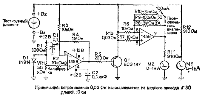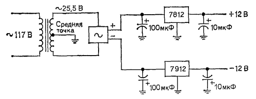 Идеально резисторы R6 и R7 должны образовать согласованную дару. Однако точные резисторы дороги и их трудно приобрести. Поэтому я рекомендую взять небольшую группу резисторов номиналом 10 кОм и промерить их с помощью цифрового мультимера. Чтобы найти два подходящих друг другу резистора, не потребуется много времени. Оставшиеся компоненты можно использовать в качестве резисторов R2 и R3. С другой стороны, резистор R13 - не обычный резистор. Я сомневаюсь, что вы сможете найти подобный резистор в обычном магазине. Но его можно изготовить из отрезка проволоки длиной 10 см и диаметром 0,26 мм, которая обычно используется для обмоток. Намотайте проволоку на каркас (карандаш), чтобы полученная катушка точно разместилась на плате. От точности подбора величины резистора R13 зависит точность измерения тока. С целью повышения точности можно начать с отрезка проволоки чуть длиннее 10 см и укорачивать его, контролируя величину тока по амперметру М2. Два измерительных прибора, регулятор "калибровка" и переключатель диапазонов, размещаются вместе с печатной платой в любом подходящем корпусе. Соединяя эти компоненты, необходимо соблюдать полярность. Для подачи питания прибора необходимы два 12-вольтных источника с выводами положительной и отрицательной полярности и общим заземленным проводом. Тип источников питания и величина напряжения не критичны. При желании питание тестера можно осуществить с помощью двух 9-вольтных батарей для транзисторных приемников. Схема одного из возможных источников питания показана на рис. 8.