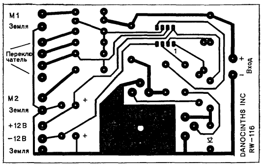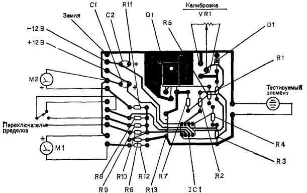 Диод D1, прямое смещение на котором задано резистором R1, определяет диапазон напряжений регулятора, ограничивая напряжение на регулировочном резисторе "калибровка". Опорное напряжение с движка этого потенциометра подается на неинвертирующий вход усилителя. На инвертирующий вход усилителя через резистор R3 подается напряжение фотоэлектрического преобразователя. Резистором R4 задается величина коэффициента усиления операционного усилителя (в данном случае она составляет 100). Благодаря своей особенности операционный усилитель пытается выравнять напряжение на своих инвертирующем и неинвертирующем входах, управляя током, текущим через шунтирующий регулировочный транзистор Q1. Транзистор снижает входное напряжение до такой величины, что оно становится равным напряжению на отводе резистора VR1. Это напряжение может регулироваться в пределах 0-0,7 В. Тем не менее реально транзистор не может иметь нулевого сопротивления, которое требуется, чтобы снизить напряжение до нуля. Как бы вы ни старались, на транзисторе сохранится небольшое остаточное напряжение величиной около 150 мВ. Это ограничивает диапазон регулирования в пределах 0,15-0,7 В. Контрольные приборы Измерение напряжения на солнечном элементе осуществляется вольтметром M1, а тока, протекающего через шунтирующий транзистор,- амперметром М2. Мощность (в ваттах) определяется перемножением показаний обоих приборов. Вольтметр подключается непосредственно к элементу. Он представляет собой щитовой прибор, рассчитанный на ток 1 мА, с последовательным ограничивающим резистором который позволяет индицировать 1 В при отклонении на полную шкалу. С другой стороны, для измерения тока вместе с амперметром М2 используется операционный усилитель. Схема построена так, что ток эмиттера транзистора Q1 должен протекать через резистор R13. Этот ток соответствует току, генерированному солнечным элементом. При протекании тока на резисторе R13 создается небольшое падение напряжения. Оно усиливается дифференциальным усилителем, напряжение на инвертирующий и неинвертирующий входы которого подается через резисторы R6 и R7 соответственно. Величина коэффициента усиления контролируется резисторами R8-R10. Резистор R8 постоянно подключен между выходом и инвертирующим входом. Его сопротивление составляет 3 МОм, а соответствующее значение коэффициента усиления - 300. Когда через резистор R13 протекает ток, равный 100 мА, выходное напряжение усилителя составляет 1 В. Выходное напряжение дифференциального усилителя измеряется вольтметром, идентичным вольтметру M1. Этот прибор отградуирован в единицах тока. В нашем случае напряжению 1 В соответствует ток 100 мА. При подключении параллельно резистору R8 резистора R10 коэффициент усиления уменьшается до 60. В этом случае напряжению 1 В на выходе усилителя соответствует ток 500 мА, протекающий через R13. Таким образом мы расширили диапазон измеряемых токов, охватывающий значения 100-500 мА. Аналогично при параллельном подключении резистора R9 к резистору R8 можно измерять токи в диапазоне 0-3 А. Конструкция тестера Хотя тестер для проверки солнечных элементов можно изготовить любым способом, настоятельно рекомендую использовать печатный монтаж. Печатная плата показана на рис. 6. Детали схемы разместите согласно рис. 7 и припаяйте их, соблюдая полярность включения полупров