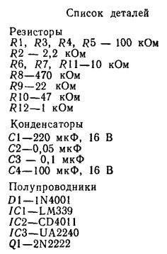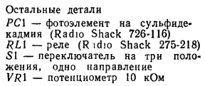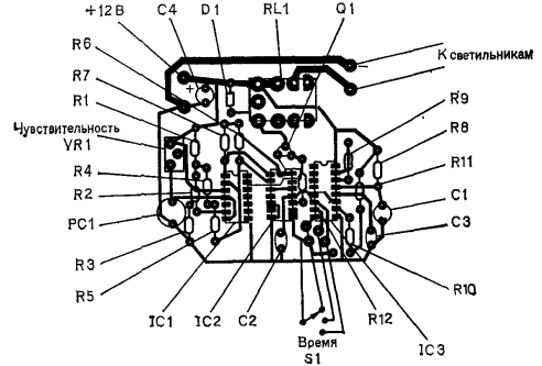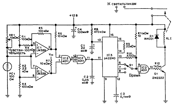 Последовательно с фоторезистором включен резистор VR1, образуя делитель, выходное напряжение которого зависит от величины сопротивления фоторезистора PC1. Чем больше света, тем меньше выходное напряжение, и наоборот. Величину напряжения контролируют два компаратора. Необходимо отметить, что нижний используется в неинвертирующем варианте включения, а верхний - в инвертирующем. Это означает, что при нулевом входном напряжении нижний компаратор выдает напряжение низкого уровня, а верхний - высокого. Компараторы включены таким образом, что нижний компаратор переключается при более низком входном напряжении, чем верхний. Как только напряжение на PC 1 увеличивается (при заходе солнца), первый компаратор переключается, на его выходе устанавливается высокий уровень напряжения. Теперь на выходах обоих компараторов устанавливается напряжение высокого уровня. В этом случае цепочка из двух логических элементов И-НЕ (7С2) выдает на вывод 11 микросхемы /C3 напряжение высокого уровня. Микросхема /C3 представляет собой программируемый таймер. Он может измерять интервалы времени длительностью вплоть до суток. Внутри этой микросхемы имеется двоичный счетчик со сквозным переносом, выходы которого можно использовать для установки времени. Переключая их, легко увеличить время срабатывания в 2 или 4 раза. Номинальное время срабатывания таймера определяется сопротивлением R8 и емкостью С1. При указанных на схеме величинах R8 и С1 напряжение на выводе 8 увеличивается через 4 ч. На подключенном к младшему разряду счетчика выводе 7 напряжение появится через 2 ч, на выводе 6 - через 1 ч. Работа таймера начнется при подаче высокого потенциала на вывод 11. Время срабатывания таймера выбирается переключателем 51 "Время", В начале цикла работы на всех выходах - низкий потенциал. Контакты реле RL 1 в этих условиях замкнуты благодаря транзистору Q1 и микросхеме /С2. Электроэнергия подводится к внешнему освещению - и фонари горят. С наступлением ночи напряжение на PC 1 продолжает увеличиваться. Вскоре верхний компаратор срабатывает и на его выходе устанавливается напряжение низкого уровня. При этом изменяется состояние входов IC2 и на вход IC3 поступает напряжение низкого уровня. Тем не менее никакого влияния на работу таймера это изменение не оказывает. По окончании заданного интервала микросхема IC3 автоматически приходит в исходное состояние. Сброс производится импульсом обратной связи, поступающим с выхода микросхемы. Поскольку на выводе 11 теперь низкий потенциал, повторного запуска микросхемы не происходит. Кроме того, в результате выключается реле и освещение гаснет. На следующее утро с восходом солнца постепенно снижается сопротивление PC 1 и, как следствие, уменьшается входное напряжение компараторов. Это могло бы привести к срабатыванию верхнего компаратора раньше нижнего, к подаче на вход таймера высокого потенциала и повторному запуску таймера. Во избежание срабатывания таймера при восходе солнца в верхний компаратор введена небольшая положительная обратная связь через резистор R5. Это приводит к появлению гистерезиса, что задерживает срабатывание, пока не переключится нижний компаратор. Высокий потенциал не может быть подан на оба выхода одновременно, и запуска таймера не произойдет. Тем не менее к вечеру цикл начнет повторяться и компараторы вернутс