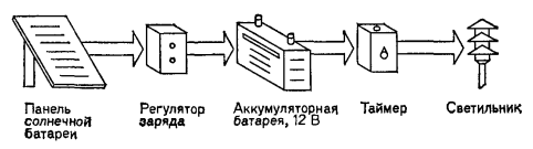Начать сборку системы можно с размещения фонарей на участке. Здесь нет никаких ограничений, можно установить фонари там, где от них будет больше пользы. Лампы соединяются параллельно о помощью толстых проводов. Если используется соответствующий комплект проводов, то необходимый провод обязательно входит в его состав. Если нет, то рекомендуется плоский осветительный кабель № 18. Электрические провода, ведущие к фонарям, присоединяются к схеме таймера. Таймер необходимо разместить так, чтобы на него могли падать солнечные лучи, а не свет фар проезжающих автомобилей или иных внешних источников. Таймер подключается к аккумуляторной батарее напряжением 12 В. От типа используемой батареи зависит ее срок службы. При Желании можно воспользоваться автомобильным аккумулятором, но он долго не прослужит в тяжелых условиях периодической работы. Лучше использовать лодочный аккумулятор. Подобные аккумуляторы созданы для работы в условиях многократных циклов глубокого разряда. Хотя они стоят несколько дороже, но прослужат гораздо дольше, чем обычный автомобильный аккумулятор. Регулятор заряда включается между солнечной и аккумуляторной батареями. В качестве регулятора заряда прекрасно подойдет этот регулятор. Необходимо просто подключить выход регулятора к аккумулятору, а вход - к солнечной батарее, соблюдая полярность. Лицевая панель солнечной батареи располагается в направлении на юг. Таймер устанавливается на время, в течение которого после захода солнца необходимо освещение. Возможно, для более полного соответствия погодным условиям потребуется подстройка таймера при смене сезонов Теперь дорожки около дома будут освещаться даже после захода солнца. Автор: Байерс Т.