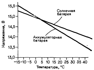 Как известно, кремниевый солнечный элемент является генератором тока. Независимо от величины напряжения до изгиба кривой ток всегда постоянен. Напряжение на элементе определяется сопротивлением нагрузки. С уменьшением сопротивления нагрузки наступает момент, когда ток больше не является определяющим фактором. Эта часть кривой названа "коленом". При больших значениях напряжения на нагрузочном сопротивлении вступают в действие законы сохранения энергии и квантовой физики, и ток спадает. Обратим пристальное внимание на этот факт, так как в нем заключается смысл саморегулирования солнечной батареи. Эта переходная точка на характеристике солнечной батареи весьма важна при дальнейшем рассмотрении. В самом деле, она разделяет два режима работы солнечной батареи. Выше ее солнечный генератор выступает в роли генератора тока, а ниже - эквивалентен регулятору напряжения. Если сравнить график работы идеального зарядного устройства с вольт-амперной кривой солнечной батареи (рис. 1), можно отметить, что две кривые очень похожи. Фактически они почти конгруэнтны. Поэтому совершенно естественно увязать вместе обе характеристики. Согласовав точку перегиба вольт-амперной кривой солнечной батареи с моментом начала газовыделения аккумулятора, можно достичь эффекта саморегулирования. Возвратимся к типичному примеру. Предположим, что процесс начинается с полностью разряженной свинцово-кислотной батареи. Подключим теперь ее к саморегулирующемуся солнечному генератору. При освещении солнечной батареи аккумулятор начинает заряжаться. В начале процесса напряжение батареи мало (<10 В). При этом солнечная батарея работает в области выше "колена" в режиме генератора тока. Другими словами, аккумулятор получает максимальный ток, который может произвести солнечная батарея, что дает возможность достичь необходимого быстрого заряда. По мере накопления заряда в аккумуляторных элементах напряжение начинает постепенно увеличиваться. Вспомните, как мы воспользовались этим увеличением в конструкции регулятора заряда. Мы снова можем сделать то же самое. Если согласовать напряжение газовыделения, которое начинается при 12,6 В в 12-вольтовой аккумуляторной батарее, с напряжением "колена" вольт-ампер ной кривой солнечной батареи, мы сможем получить снижение зарядного тока. Предполагая, что аккумулятор достиг стадии газовыделения, мы наблюдаем, что солнечная батарея выходит из режима стабилизации тока. Теперь увеличение заряда аккумуляторной батареи и напряжения на ней вынудит солнечную батарею работать в режиме регулятора напряжения. В результате снизится зарядный ток. Чем больше заряд на батарее, тем больше становится статическое напряжение и тем дальше рабочая точка на характеристике солнечной батареи продвигается в область ниже "колена". За ростом напряжения следует соответствующее снижение выходного тока солнечной батареи. К моменту полного заряда аккумуляторных элементов рабочая точка сдвигается по характеристике так далеко вправо, что теперь от солнечной батареи течет лишь небольшой подпитывающий ток. Он столь мал, что батарея может оставаться в таком состоянии сколько угодно долго, без опасения перезаряда. В этой точке напряжение на батарее принимает значение 13,2 В. В таком положении все остается до тех пор, пока мы не израсходуе