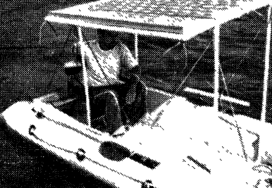 Имея небольшую скорость движения по воде (9,4 км/ч), эта лодка прекрасно подходит для ловли рыбы или просто для приятной прогулки в солнечный день. Солнечные батареи устанавливаются на навесе, защищающем пассажиров от лучей солнца (рис. 3). Кроме питания лодочного электромотора фотоэлектрическая систем может также обеспечить электроэнергией радиоприемник, систему освещения или водяной насос. Конструкция Начинаем наше описание с лодки. Хотя для выбора имеется множество типов лодок, предпочтение было отдано мною надувной понтонной лодке по двум причинам. Во-первых, она надувная. А это означает, что она портативная и в спущенном состоянии удобна для хранения. Во-вторых, надувная лодка - добротное, устойчивое судно, которым можно пользоваться в течение длительного времени. В дальнейшем я подробно объясню, как было осуществлено преобразование солнечной энергии на данной конкретной лодке. Если вы лучше меня разбираетесь в лодках и захотите смонтировать солнечную батарею на лодке другого типа, воспользуйтесь тем не менее следующими рекомендациями. Вначале устанавливаются солнечные батареи. В данной конструкции использовались солнечные батареи М-61 фирмы ARCO Solar, Inc. саморегулирующего типа. Каждая батарея М-61 мощностью 25 Вт конструктивно выполнена в виде панели длиной 120 см, шириной 30 см и толщиной 4 см, содержащей 30 монокристаллических круглых элементов диаметром 10 см. Батарея рассчитана на напряжение 14,1 В и ток 1,75 А. Если вы хотите сами изготовить солнечную батарею, постарайтесь, чтобы ваша батарея имела такие же характеристики. Убедитесь в том, что солнечные батареи абсолютно водонепроницаемы: уж чего-чего, а влаги будет предостаточно! Для движения лодки потребуются четыре солнечные батареи с указанными характеристиками. Разместите их в один ряд на панели размером 120x120 см2 и соедините параллельно. Полный ток четырех параллельно соединенных батарей составляет 7 А, а напряжение 14 В. Панель солнечных батарей крепится к палубе с помощью каркаса из полихлорвиниловых водопроводных труб диаметром 4 см (Schedule-40). Пластмассовая трубка - отличный материал для подобных целей; она жестка, недорога, легка и главное не подвержена коррозии. Каркас из труб выполняется в соответствии со схемой, приведенной на рис. 4. Соединения под 90° выполнены с помощью угольников, а верхняя рама прикрепляется с помощью тройников.