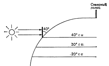 Угол наклона оси (полярный угол) определяется географическим положением и соответствует широте места, в котором смонтировано устройство. Предположим, вы живете в местности, соответствующей 40°с.ш. Тогда ось следящего устройства будет повернута на угол 40° к горизонту (на Северном полюсе она перпендикулярна поверхности Земли (рис. 2).