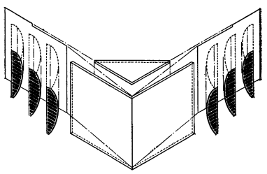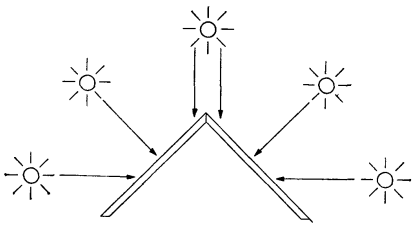Солнечная батарея состоит из двух панелей, содержащих по три элемента, соединенных последовательно и размещенных на плоскостях прозрачного пластмассового корпуса. Панели соединены параллельно. Эти панели монтируются под прямым углом друг к другу. В результате по крайней мере один из модулей будет постоянно освещен солнцем (с учетом рассмотренных ниже ограничений). Сначала рассмотрим случай, когда все устройство расположено так, что биссектриса угла, образованного панелями, направлена точно на солнце. При этом каждая панель наклонена под углом 45° к солнцу (рис. 4) и вырабатывает электрическую энергию.