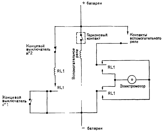 Из рисунка видно, что это простая схема переключателя полярности При подаче питания электромотор начинает вращаться. Направление его вращения зависит от полярности источника питания. В момент подачи питания реле переключения полярности RL1 не срабатывает, потому что цепь питания его обмотки разорвана нормально разомкнутыми контактами. Электромотор вращает раму по направлению к концевому выключателю № 1. Этот выключатель расположен так, что рама упирается в нею только в крайнем положении своего вращения. Автор одинаково обозначает на схемах рис 3 и 6 различные реле. Во избежание путаницы в дальнейшем реле RL1 на рис 3 называется герконовым реле следящей системы, а его контакты на рис 6 называются герконовыми. Реле RL1 на рис 6 - более мощное, чем герконовое, с тремя группами переключающих контактов. При замыкании этого выключателя срабатывает реле RL1, которое меняет полярность питающего напряжения электромотора, и последний начинает вращаться в противоположном направлении. Хотя концевой контакт № 1 снова размыкается, реле остается включенным благодаря тому, что его контакты замкнуты. При нажатии рамы на концевой выключатель № 2 цепь питания реле RL1 размыкается и реле выключается. Направление вращения мотора снова изменяется, и слежение за небосводом продолжается. Цикл прерывается только с помощью герконового реле RL 1 из схемы слежения за интенсивностью солнечного излучения, которое управляет схемой питания электромотора. Однако реле RL 1 - слаботочный прибор и не может непосредственно коммутировать ток мотора. Таким образом, герконовое реле коммутирует вспомогательное реле, которое управляет электромотором, как показано на рис. 6. Солнечные батареи системы слежения необходимо расположить вблизи механизма вращения. Угол их наклона должен совпадать о углом наклона полярной оси, а стык батарей направлен на полуденное солнце. Электронный модуль подключается непосредственно к устройству вращения. Щель крышки фототранзистора сориентируйте параллельно полярной оси. Тем самым учитываются сезонные изменения в положении солнца над горизонтом. Автор: Байерс Т.