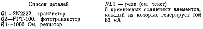 По окончании проверьте надежность герметизации, в особенности по краям солнечных элементов. Может быть, потребуется слегка обжать края лавсана, пока он еще горячий. После того как панели достаточно остынут, склейте их вместе согласно рис. 5 и соедините их параллельно. Не забудьте припаять к батареям выводы, прежде чем собирать устройство. Электронный мозг Следующим важным элементом конструкции является реле. Практически реле представляет собой катушку, намотанную на герконовый контакт небольшого размера. Обмотка реле состоит из 420 витков эмалированного медного провода № 36, намотанного на каркас достаточно малого размера, чтобы в него с натягом входил герконовый контакт. Я использовал в качестве каркаса соломинку для коктейля. Если вы прикоснетесь горячим лезвием ножа к концам соломинки, образуются как бы щечки каркаса, предохраняющие обмотку от сползания за края. Полное сопротивление обмотки должно составлять 20-30 Ом. Вставьте геркон в каркас и зафиксируйте его каплей клея. Затем присоедините к реле транзистор Q1 и резистор R1. Не подключая транзистор Q2, подайте электропитание от солнечных элементов и проверьте работоспособность схемы. Если все работает правильно, реле должно срабатывать, когда интенсивность солнечного света составляет около 60% полной интенсивности. Для этого можно просто прикрыть 40% поверхности солнечных элементов непрозрачным материалом, например картоном. В зависимости от качества геркона, возможно, будут наблюдаться некоторые отклонения от идеального значения. Приемлемо начало работы реле при интенсивности света, составляющей 50-75% максимально возможной величины. С другой стороны, если вы не уложились в эти пределы, необходимо изменить либо количество витков обмотки реле, либо ток солнечной батареи. Количество витков обмотки реле следует менять в соответствии со следующим правилом. Если реле срабатывает раньше, количество витков необходимо уменьшить, если позже - увеличить. Если вы хотите поэкспериментировать с изменением тока солнечной батареи, подключите к ней шунтирующий резистор. Теперь подсоедините к схеме фототранзистор Q2. Его надо поместить в светонепроницаемый корпус, иначе он не будет правильно работать. Для этого возьмите медную или алюминиевую трубу длиной около 2,5 см и диаметром, соответствующим диаметру корпуса транзистора. Один конец трубы следует расплющить так, чтобы осталась щель шириной 0,8 мм. Закрепите трубу на транзисторе. Готовая схема управления, содержащая элементы Q1, Q2, R1 и RL1, с целью герметизации заливается жидким каучуком. От устройства выводятся четыре привода: два - от контактов реле, два - от солнечных батарей. Для заливки жидкого каучука используется форма из плотной бумаги (типа почтовой карточки). Для ее изготовления листом бумаги оберните карандаш и закрепите бумагу, чтобы она не развернулась После засыхания слоя полимера вокруг схемы удалите бумажную форму. Работа с устройством Эксплуатировать следящее устройство достаточно просто. Для начала соберите несложный следящий механизм. Укрепите вашу батарею на вращающейся оси. Вы можете закрепить батарею на подходящей раме, после чего присоединить раму к трубе, используя подшипники трения или качения. Затем установите мотор с редуктором для вращения рамы вокруг оси. Это можно сделать множеством способов. Поск