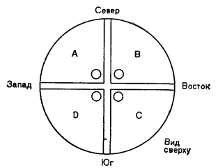 Чувствительная головка состоит из непрозрачного основания, в центре которого расположены четыре светочувствительных датчика. В нашем устройстве использованы для этой цели инфракрасные фототранзисторы. Фототранзисторы разделяются двумя тонкими металлическими полукруглыми перегородками, в которых до середины выпилены пазы, что позволяет обеспечить соединение, как показано на рис. 2. Подобная конструкция предпочтительнее устаревшей картонной. Отметим, что каждый транзистор находится в своей отдельной секции. Если вы расположите устройство, как показано на рис. 3, то все фототранзисторы, кроме одного (ближайшего к нам), скроются из виду. Эта ситуация эквивалентна наиболее привычному рабочему положению устройства при освещении. Другими словами, один датчик улавливает солнечные лучи, в то время как другие находятся в тени. Воспользуемся этим явлением. Расположим чувствительную головку так, чтобы ее перегородки были ориентированы в направлениях север - юг и восток - запад, как показано на рис. 4. Каждая секция с фототранзистором помечена буквами А, В, С, D. Теперь рассмотрим различные варианты взаимного положения чувствительной головки и солнца.
