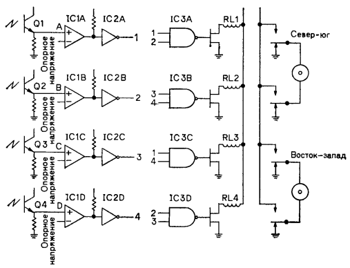 Не вдаваясь пока в детали, достаточно сказать, что, когда фототранзистор Q1 не освещен, на выходе микросхемы IC2A имеется напряжение высокого уровня. То же самое справедливо для фототранзисторов Q2, Q3 и Q4: если они не освещены, на соответствующих выходах микросхемы IC2 имеется высокий потенциал. Именно эти четыре выходных сигнала будут использоваться для управления двумя моторами. Логическая задача управления решается микросхемой IC3. Она состоит из четырех элементов И-НЕ, объединенных в одном корпусе (все четыре элемента работают независимо друг от друга). Если на оба входа элемента И-НЕ подать высокий потенциал, на выходе установится напряжение низкого уровня. Чтобы понять, каким образом микросхема IC3 преобразует эти беспорядочные данные в команды управления, рассмотрим пример. Предположим сначала, что на всех выходах инверторов IC2 имеется высокий потенциал (что соответствует темному времени суток). Затем допустим, что лучи утреннего солнца попадают в секцию А, освещая фототранзистор Q1. В результате на выходе IC2 устанавливается низкое напряжение. На выходе IC3 появится напряжение высокого уровня. Вспомним, что на выходе элемента И-НЕ будет присутствовать высокий потенциал, пока на обоих входах отсутствует большое напряжение. Звучит непривычно, но это - отрицательная логика. Выходным напряжением элемента И-НЕ управляется полевой транзистор МОП-структуры с V-образными канавками, в цепи стока которого включено реле. Реле срабатывает, когда на выходе логического элемента появляется высокое напряжение. Всего в схеме четыре формирователя и четыре реле. Контакты реле включены таким образом, что реле RL1 и RL2 управляют одним мотором, а реле RL3 и RL4 - другим. Тогда по сигналу с фототранзистора Q1 микросхема IC3A включит реле RL1. При замыкании контактов реле RL1 на мотор подается напряжение, и азимутная следящая система поворачивается в северном направлении, потому что, если свет падает на Q1, солнце должно быть на севере. Так осуществляется поиск солнца системой. Однако снижение выходного напряжения IC2A также приводит еще к одному результату. На выходе микросхемы IC3C (вход которой подключен к выходу IC2A) устанавливается высокий потенциал, и срабатывает реле RL3. Логическая схема IC3C вполне справедливо "решила", что солнце находится к западу от секций В, С и D, и начинает поворачивать систему в западном направлении. В результате одновременно оба мотора перемещают устройство в северо-западном направлении, поскольку именно там находится солнце. Освещение транзистора Q4 будет соответствовать среднему положению солнца между северным и южным датчиками чувствительной головки. Как только это произойдет, на выходе микросхемы IC2D установится напряжение низкого уровня, а на выходе микросхемы IC3B - напряжение высокого уровня и сработает реле RL2. Оба вывода мотора подключаются к одному и тому же полюсу источника питания, и мотор остановится. В то же время следящая система продолжает поиск солнца в направлении на запад. Направление на солнце находится, когда оба транзистора, Q2 и Q3, освещаются его лучами. В результате срабатывает реле RL3 и мотор ориентировки системы в направлении восток - запад останавливается . Когда освещены все четыре датчика, то включаются все четыре реле и моторы не работают. Чувствительная головка обнаружила солнце и теперь точно направлена в 
