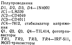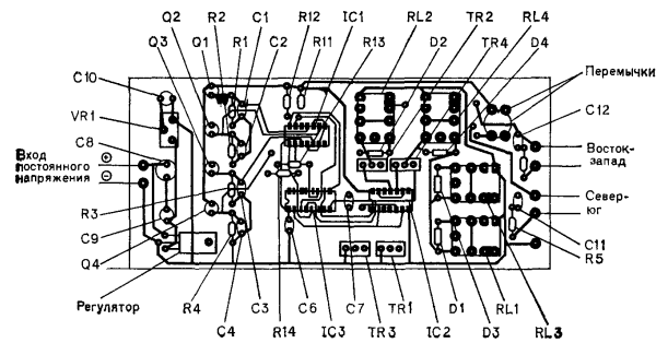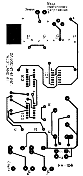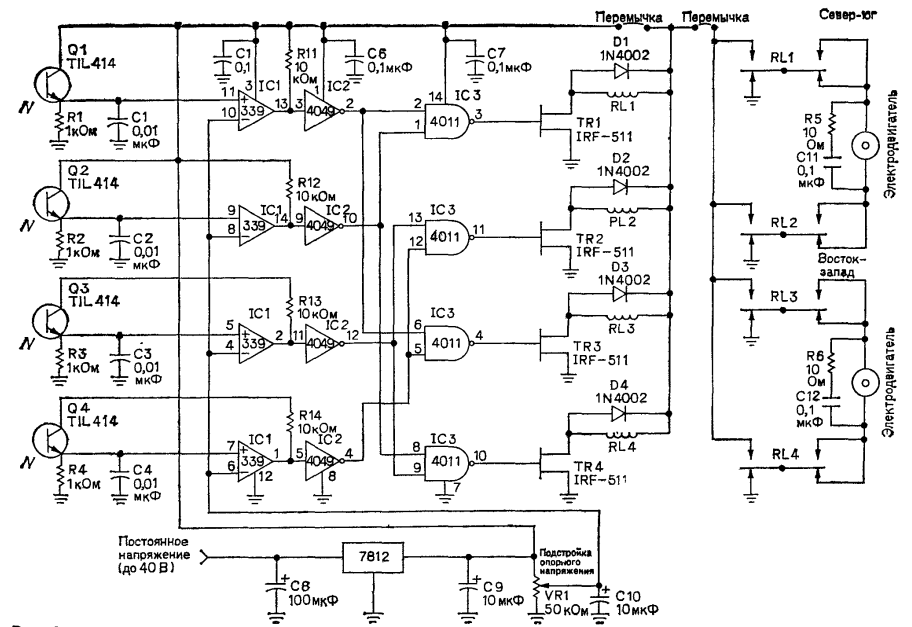 Из-за наличия реле печатная плата имеет достаточно большие размеры. Используются стандартные реле типа двухполюсного переключателя в прозрачном корпусе. Контакты рассчитаны на ток 10 А при переменном напряжении 125 В. Тем не менее ограничивающим фактором является не тот постоянно протекающий ток, который выдерживают контакты реле, а ток, который они могут прерывать. Поэтому для увеличения предельных коммутируемых токов две пары контактов включаются последовательно. Известно, что при размыкании контактов возникает электрическая дуга. Она вызвана э. д. с. самоиндукции, возникающей при разрыве цепи питания электромотора. В цепи переменного тока дуга быстро пропадает при реверсировании направления электрического поля. Однако в цепи постоянного тока дуга может поддерживать себя достаточно долгое время. Предотвратить образование дуги можно увеличением расстояния между контактами и скорости их разъединения. При последовательном соединении контактов реле суммарное расстояние между разомкнутыми контактами удваивается и увеличивается скорость их разъединения. Следовательно, реле может коммутировать нагрузку, превышающую паспортное значение. Реле обычно поставляется вместе с соединительным разъемом, что очень полезно для согласования с моторами следящей системы, поскольку реле выпускаются на различные стандартные напряжения питания в диапазоне от 6 В постоянного или переменного тока до 120 В. Я советую не припаивать реле непосредственно к плате, а соединять через разъемы, тогда можно подобрать реле с любым напряжением питания. Для удобства шина питания реле изолирована от плюсового провода питания. Для подключения реле к "плюсу" источника питания просто припаяйте перемычку, как отмечено на схеме. Если используются реле с напряжением питания более 60 В постоянного тока, необходимо подобрать полевые транзисторы, выдерживающие большие напряжения (они выпускаются на напряжение свыше 400 В). Не забудьте также заменить и диоды D1 - D4 на диоды, рассчитанные на большее напряжение, и никогда не используйте диоды с реле, питающимися от переменного тока. Другая часть устройства, требующая особого внимания, - это эмиттерные резисторы R1, R2, R3 и R4. Маловероятно, что вы сможете найти четыре фототранзистора с настолько близкими характеристиками, что напряжения их эмиттеров совпадут при одинаковой освещенности. Для компенсации разброса параметров необходимо подобрать значения эмиттерных резисторов. Номинал в 1 кОм - это лишь ориентировочное значение резисторов при наладке, и его необходимо подбирать более точно. Имейте в виду, что величина сопротивления может зависеть от температуры. Проще всего подобрать величину сопротивления, заменив постоянный резистор переменным. Начните с величины сопротивления 1 кОм. При освещении чувствительной головки светом с различными уровнями интенсивности можно получать определенную таблицу значений напряжения. Не пытайтесь заменить солнечное освещение светом лампы накаливания. Фототранзисторы чувствительны к инфракрасному излучению и по-разному реагируют на эти источники света. Если при измерениях обнаружится, что один фототранзистор реагирует слишком быстро на изменение освещенности, уменьшите величину резистора. Однако при этом необходимо снизить сопротивление всех резисторов, чтобы сохра
