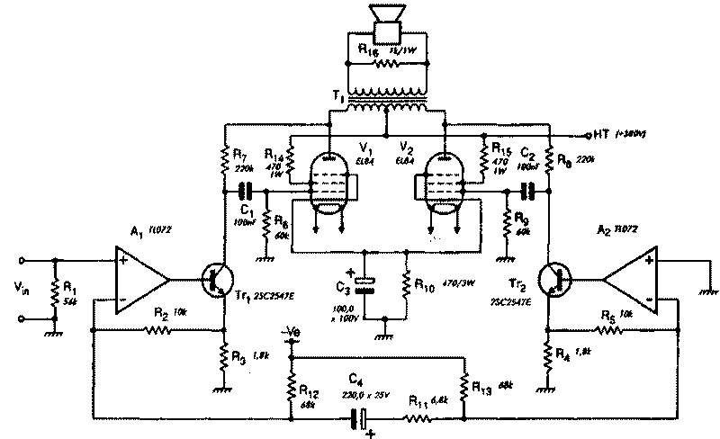 ЭНЦИКЛОПЕДИЯ РАДИОЭЛЕКТРОНИКИ И ЭЛЕКТРОТЕХНИКИ Лампово-полупроводниковый УМЗЧ. Энциклопедия радиоэлектроники и электротехники Энциклопедия радиоэлектроники и электротехники / Усилители мощности ламповые В ряде статей на страницах журналов, посвященных аудиотехнике, часто обсуждается вопрос: что для усилителей лучше - лампы или транзисторы? При этом описываются как конструкции ламповых (в которых и выпрямители иногда выполнены на кенотронах), так и транзисторных УМЗЧ. Редакция решила познакомить читателей с кратким описанием особенностей комбинированного УМЗЧ, выполненного на усилительных приборах разных поколений: лампах, транзисторах, интегральных микросхемах. Параметры комбинированного усилителя весьма необычны для ламповых УМЗЧ. Достаточно указать, что для двухтактного трансформаторного УМЗЧ на двух выходных пентодах EL84 достигнута выходная мощность 32 Вт с полосой полной мощности 5...55 000 Гц (на уровне -3 дБ). Коэффициент гармоник на частоте 1000 Гц при выходной мощности 20 Вт не превышает 0,07%. Выходное сопротивление усилителя составляет 0,6 Ом. Каким же образом достигнуты такие параметры, если устройство (рис. 1) содержит, кроме выходных ламп, лишь два высоковольтных транзистора и пару операционных усилителей? В отличие от транзисторных усилителей мощности, ламповым УМЗЧ необходим выходной согласующий трансформатор, оптимизирующий нагрузочную характеристику ламп для получения максимальной выходной мощности. При этом сопротивление громкоговорителя трансформируется в нагрузочное сопротивление ламп. Применение трансформатора неизбежно ограничивает полосу эффективно усиливаемых частот, причем низкочастотная граница АЧХ обусловлена фильтром ВЧ, образованным выходным сопротивлением ламп каскада и индуктивностью первичной обмотки, шунтирующей нагрузку. Высокочастотная граница определена фильтром НЧ, состоящим из того же выходного сопротивления и паразитной индуктивности рассеяния первичной и вторичной обмоток, что также приводит к уменьшению сигналов в нагрузке. Следовательно, чем меньше выходное сопротивление ламп каскада, тем шире диапазон пропускаемых частот сигнала. Отрицательная обратная связь (ООС), применяемая для уменьшения гармонических и частотных искажений как ламп, так и трансформаторов, в таких каскадах имеет ограниченное применение из-за сложной фазовой характеристики трансформатора. Фазовые сдвиги, образуемые его паразитными индуктивностями рассеяния и емкостями обмоток, а отчасти и проходной емкостью самих ламп, приводят к тому, что на высоких частотах связь становится положительной и возникает ухудшение параметров или даже самовозбуждение. Для получения широкой полосы частот, кроме применения высококачественного трансформатора, необходимо снизить выходное сопротивление ламп. Этого можно достичь параллельным включением ламп, использованием ламповых триодов (или многосеточных ламп, включенных триодом). Применение ламп в режиме катодного повторителя очень не экономично ввиду низкого коэффициента передачи по напряжению (меньше единицы). Оптимальным путем снижения выходного сопротивления ламп является применение в каскаде параллельной отрицательной обратной связи по напряжению, образующей источник напряжения, управляемый током (в отечественной литературе используется 