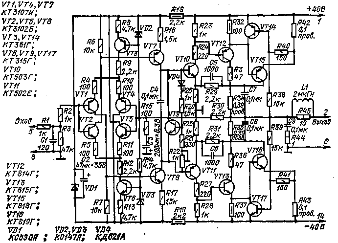 Элементы С1, С5, С6, С7, С8, С9, R44, L1 предназначены для коррекции частотной характеристики на высоких частотах. Они же обеспечивают устойчивость усилителя при охвате его общей ООС и при возможных изменениях нагрузки. Транзисторы VT14, VT17 шунтируют при перегрузке эмиттерный переход выходных транзисторов. Питается усилитель от нестабилизированного двухполярного источника ±40 В.